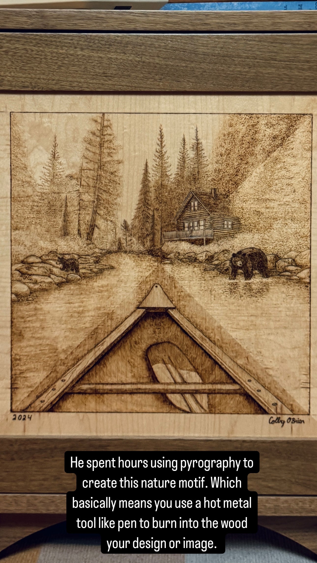 The nature motif is really something special considering it was all done using pyrography which is a technique where by the artist will use a heated metal pen/tool to burn their design directly into the wood. It took hours of painstakingly small detailed hand movements to create this artwork.