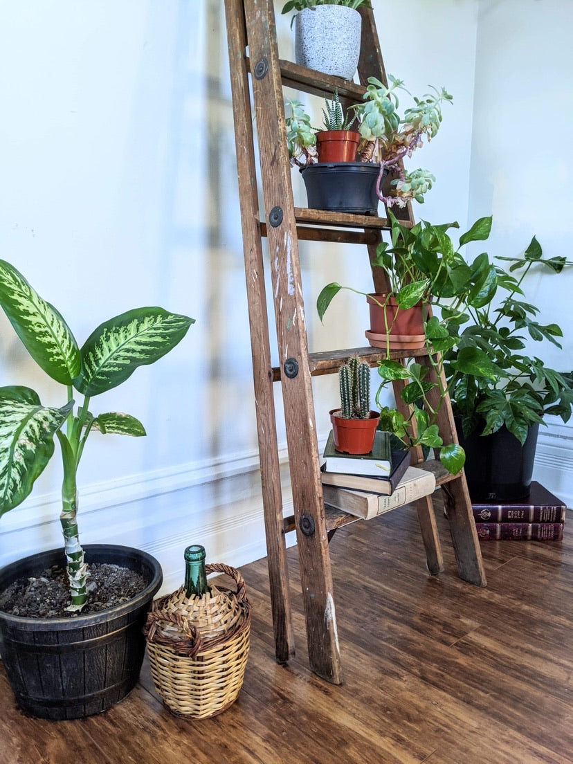 Now comes a new dawn, a new era, of old ladders you got from your Grandpa that can be used as “oh so retro & hip shelving/displays” for your plants!