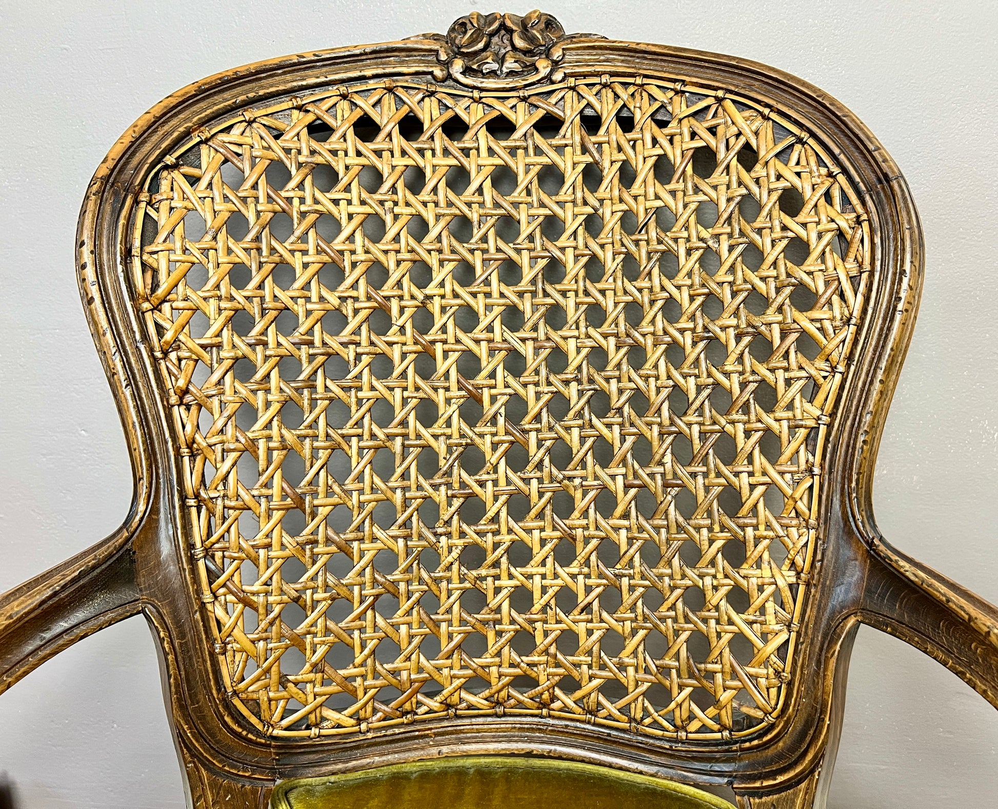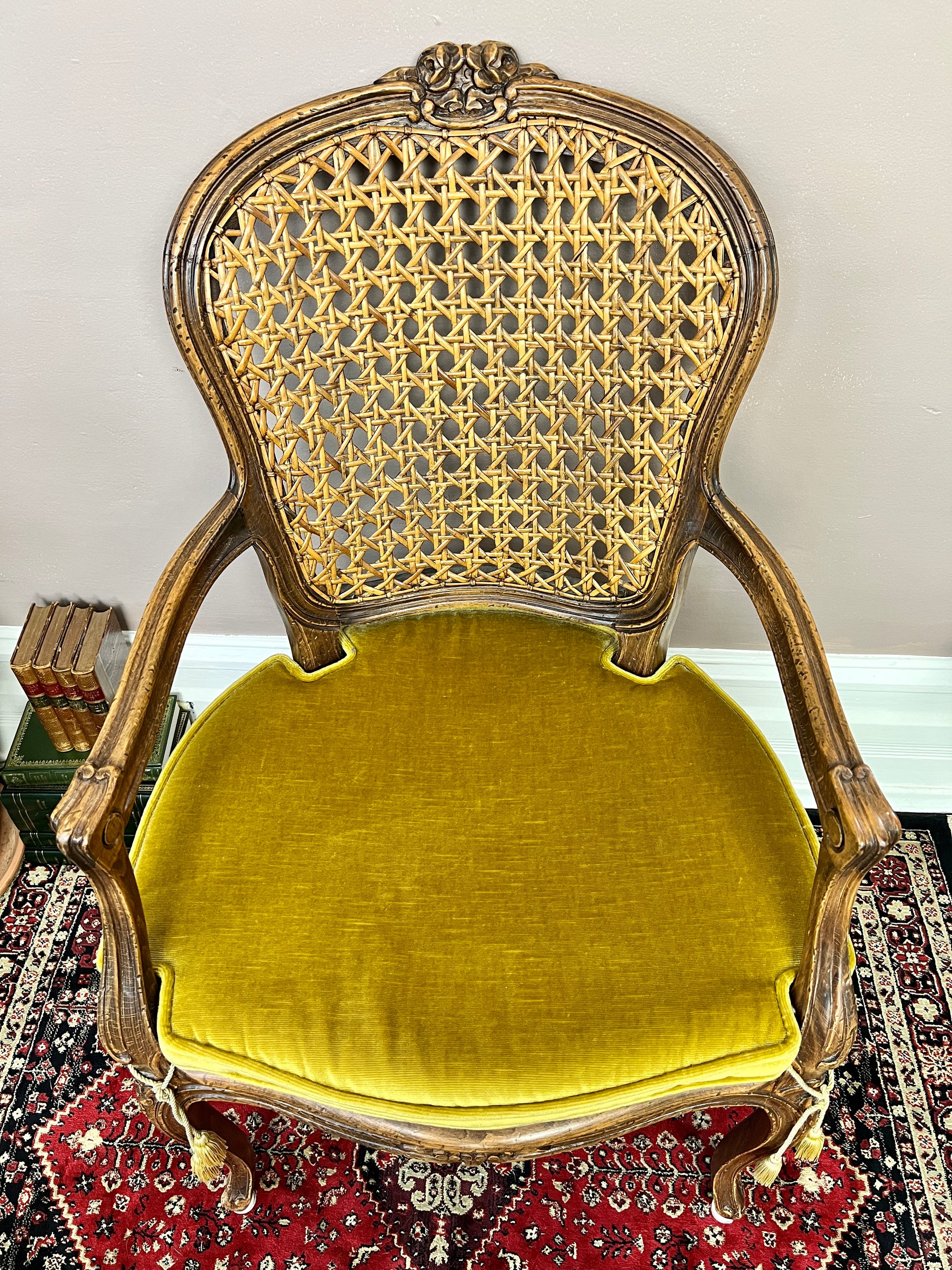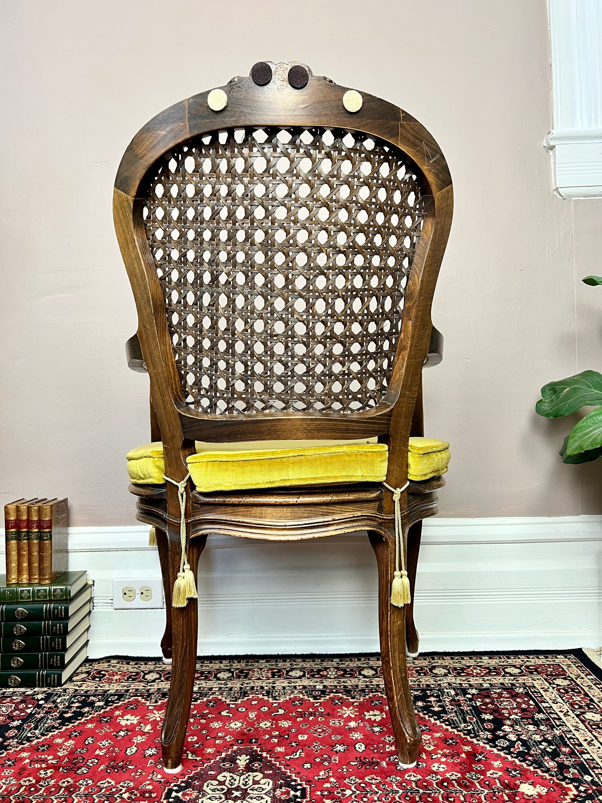 - Antique cane back & seat chair with yellow velvet seat upholstery