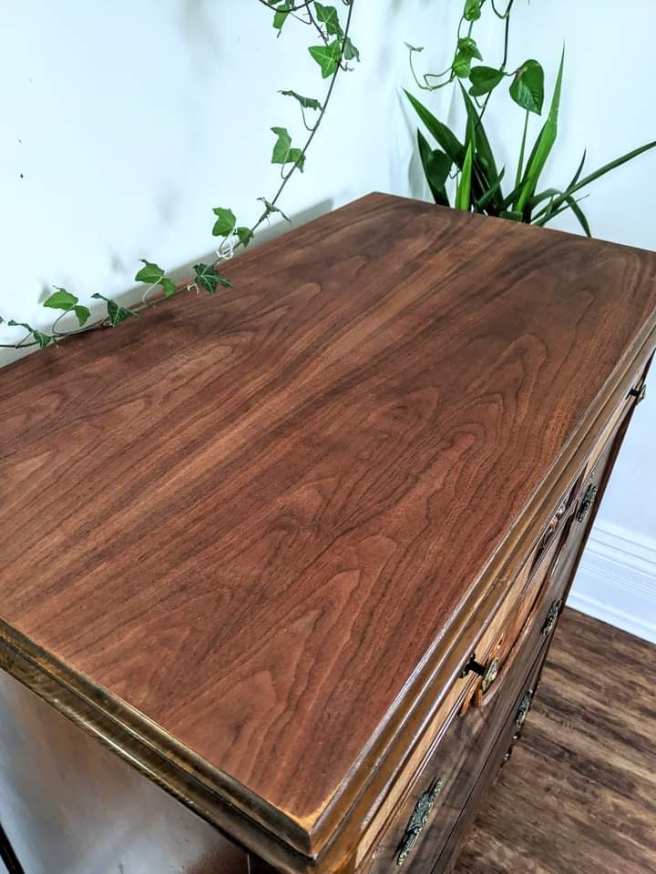 We sanded, stained & oiled it to bring out the beautiful wood patterns in the solid walnut!