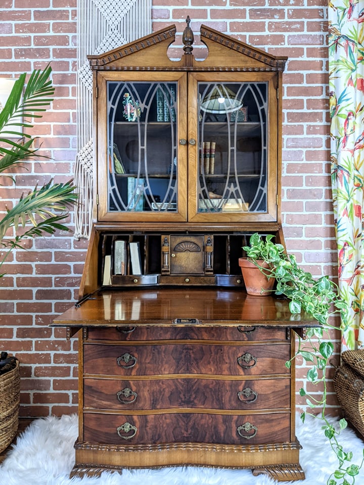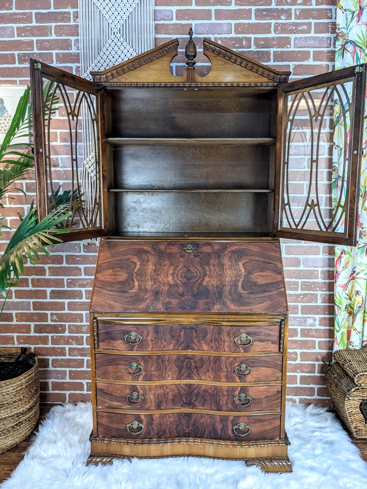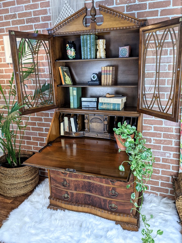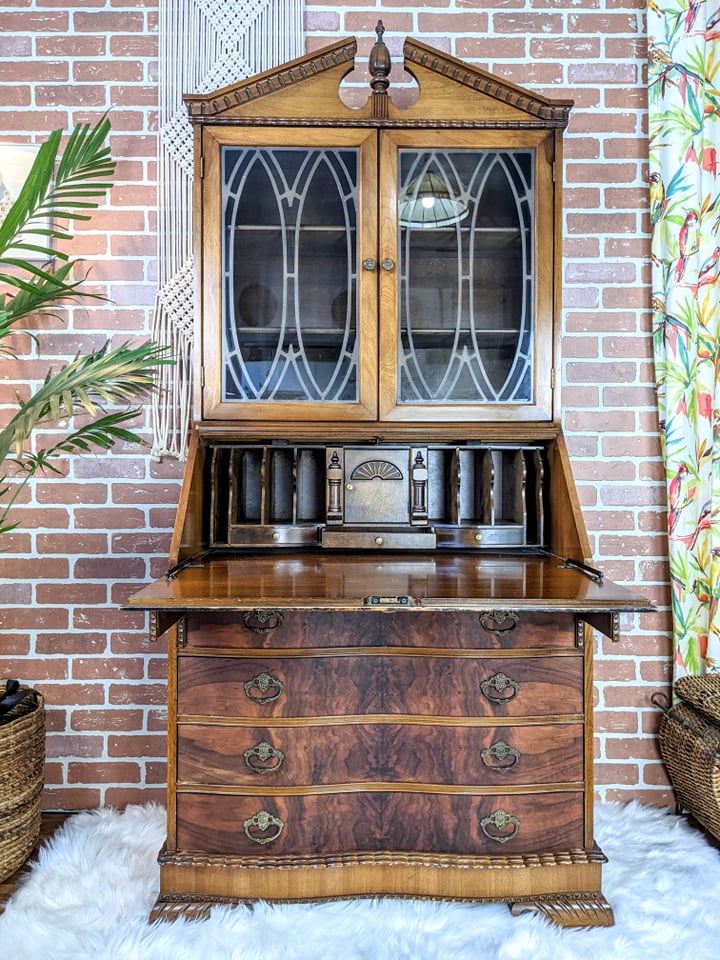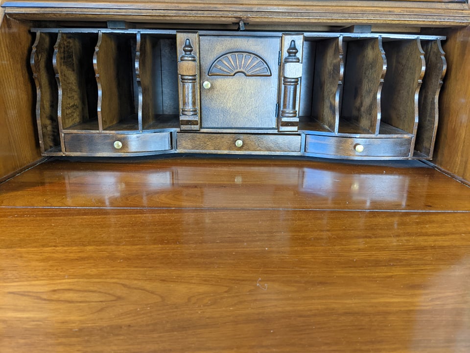 With 4 drawers, a cabinet, desk & cubbies, this secretariat not only has charm but plenty of space!