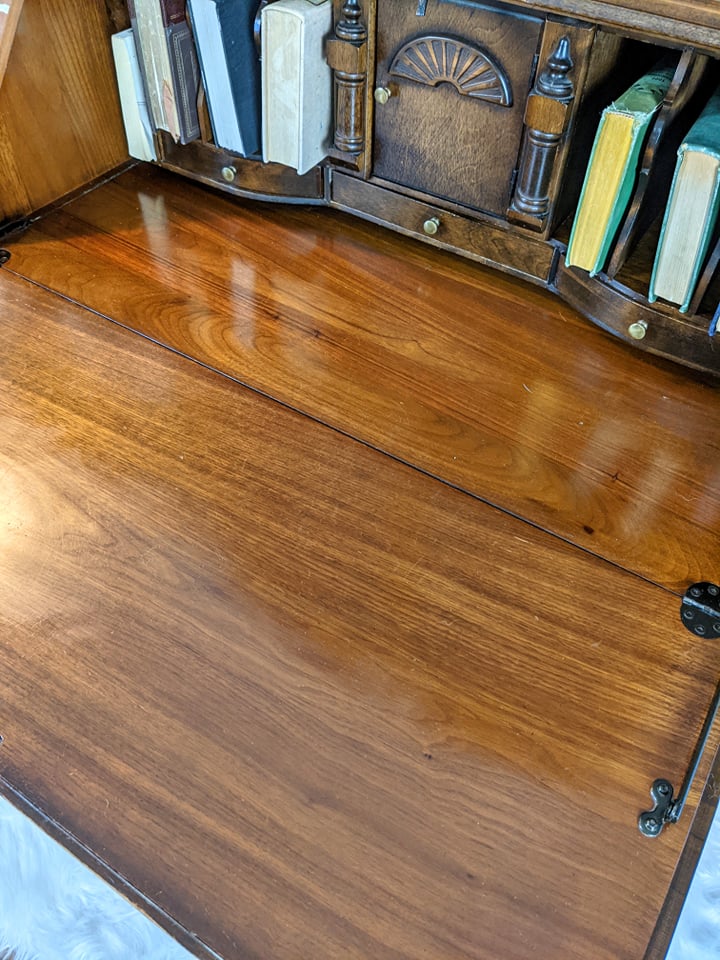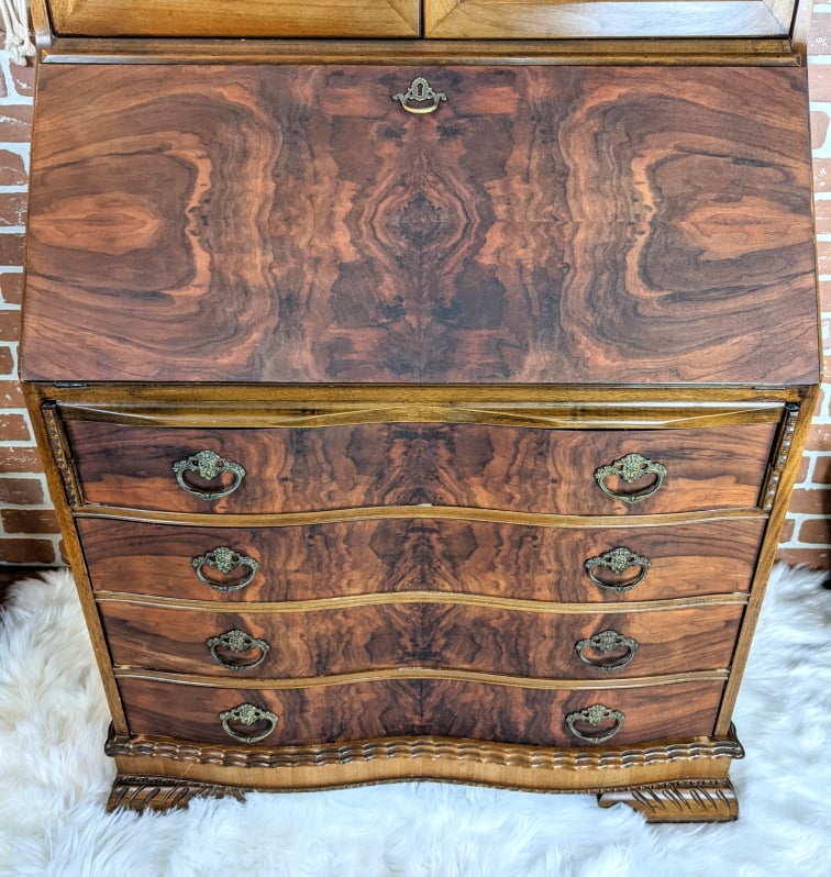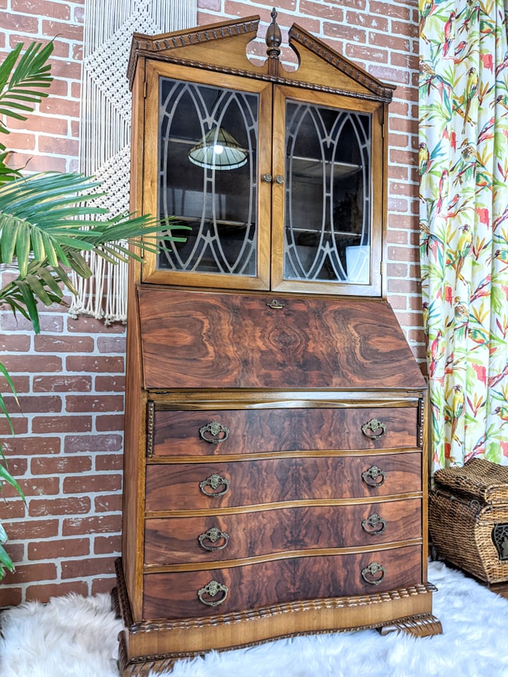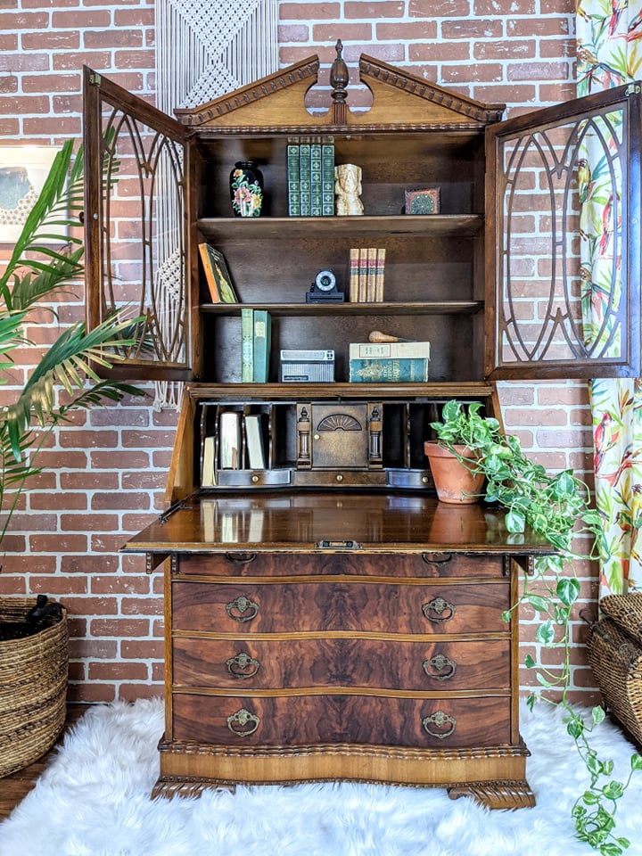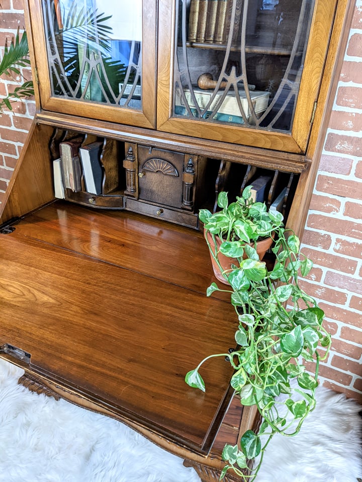With 4 drawers, a cabinet, desk & cubbies, this secretariat not only has charm but plenty of space!