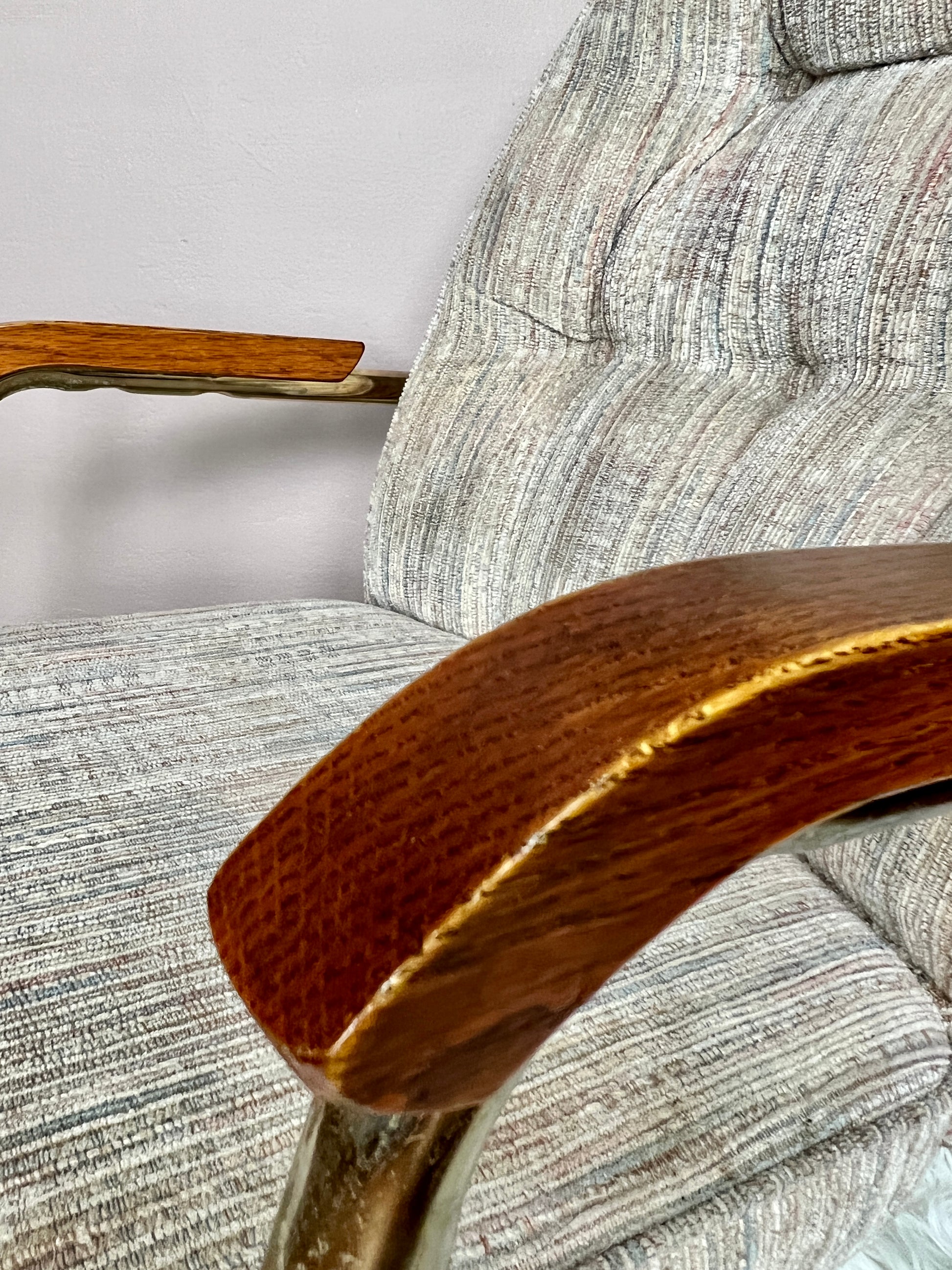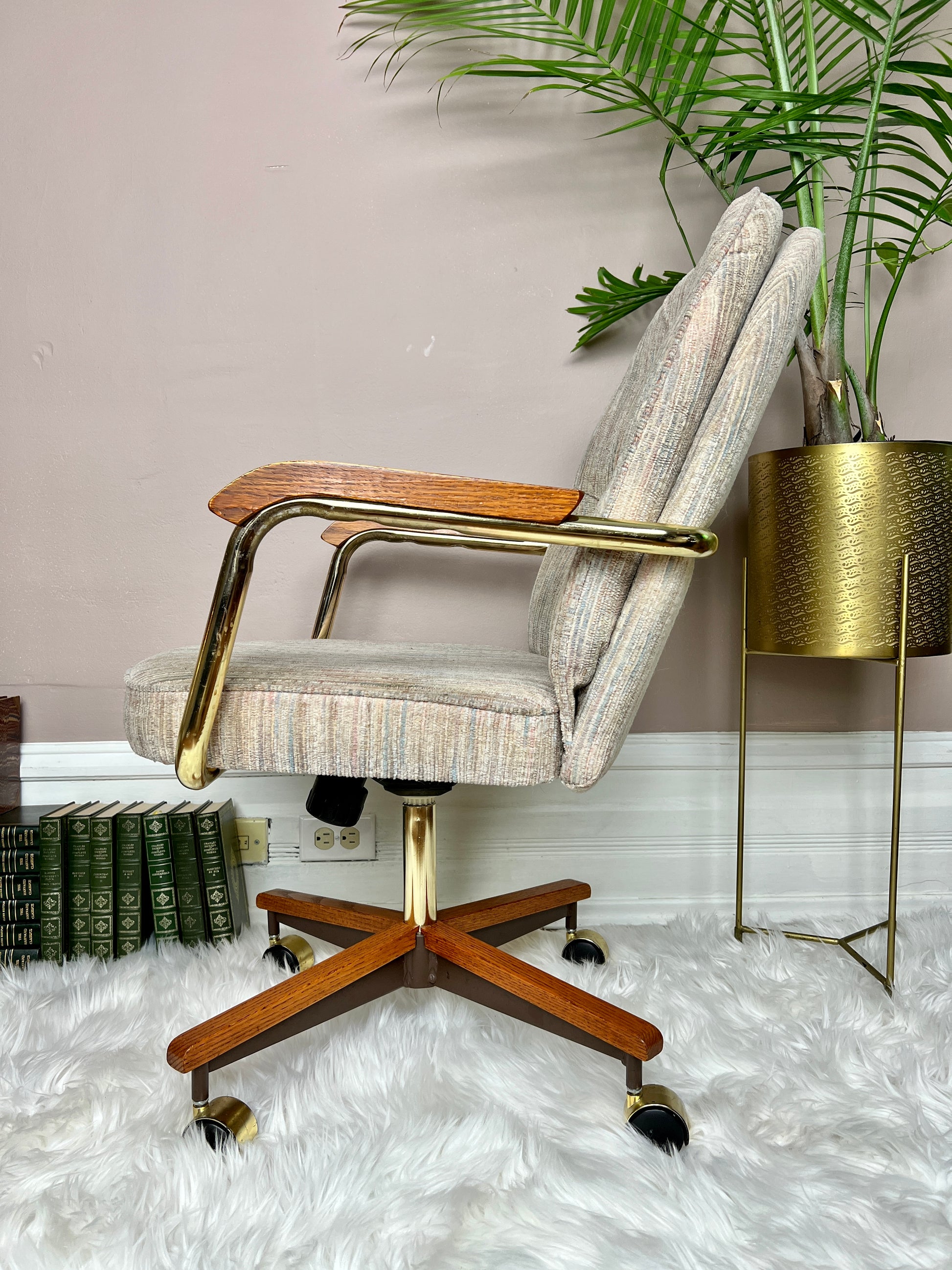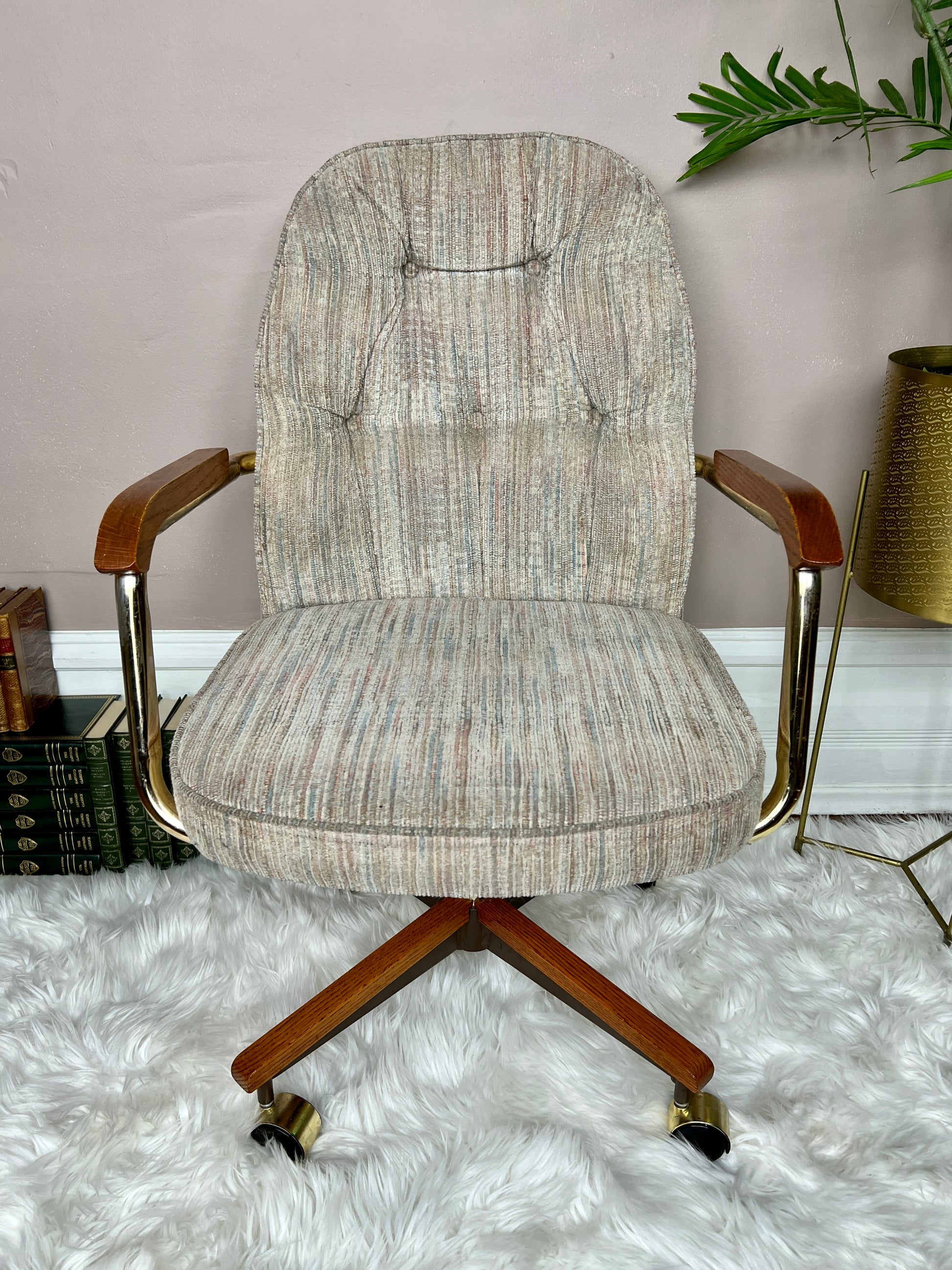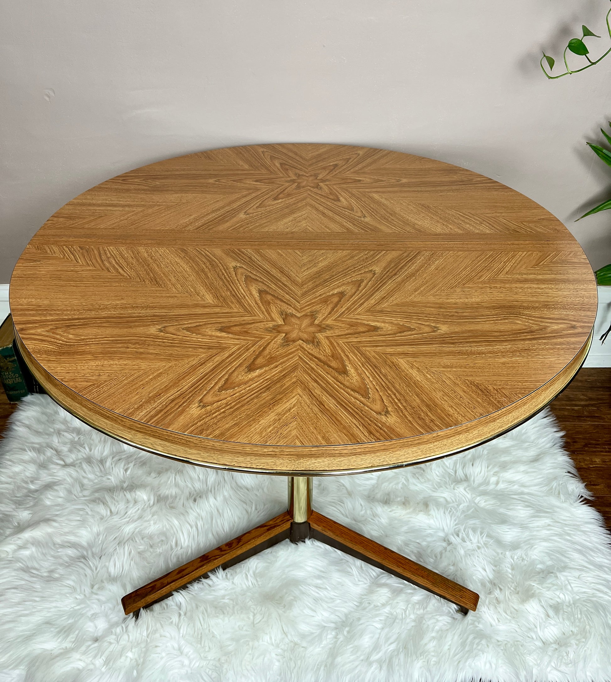 This 5 piece is quite the beauty. Made in Canada & still in great condition, it has solid oak & brass accents, & the table top design is really groovy!