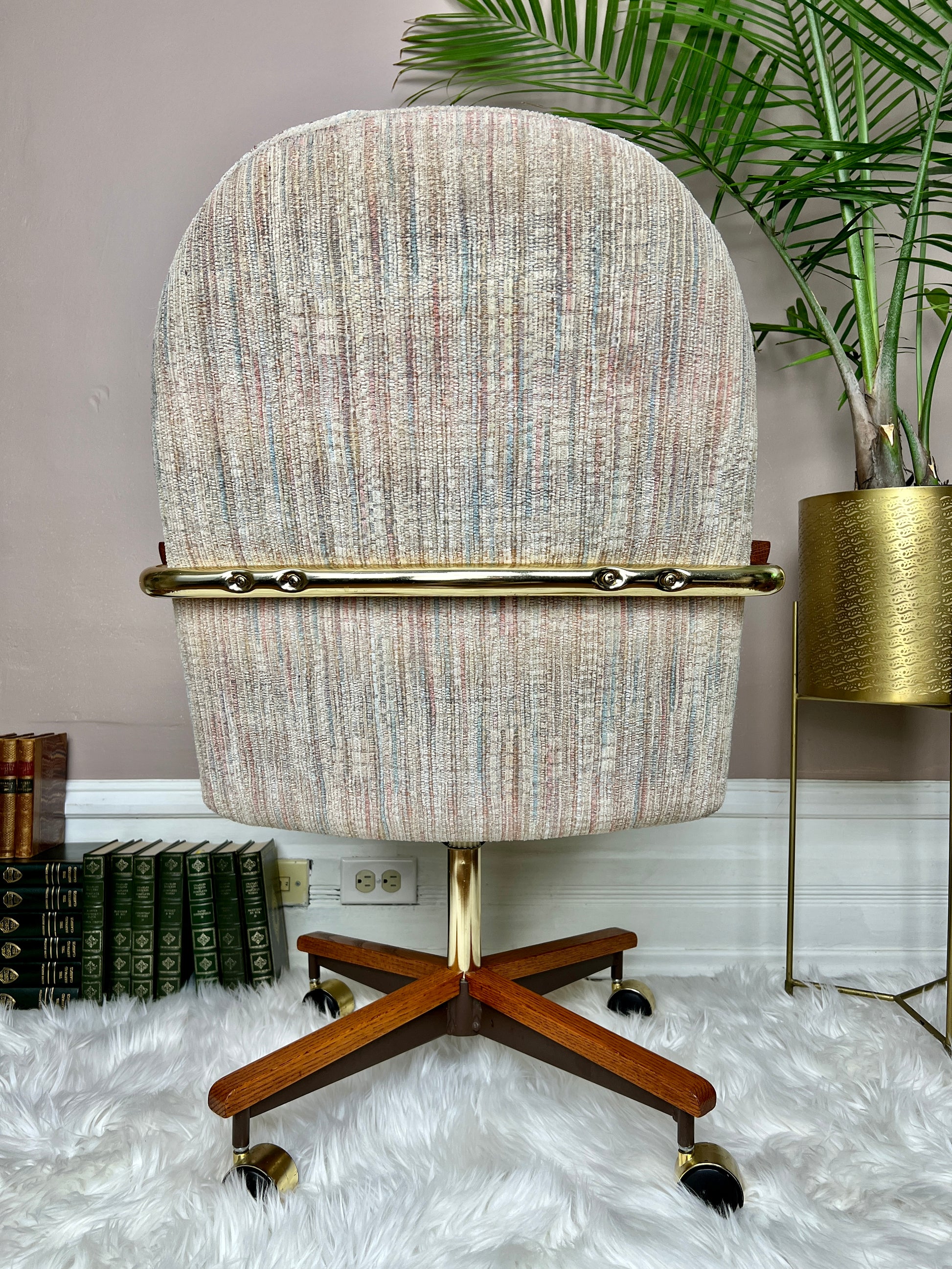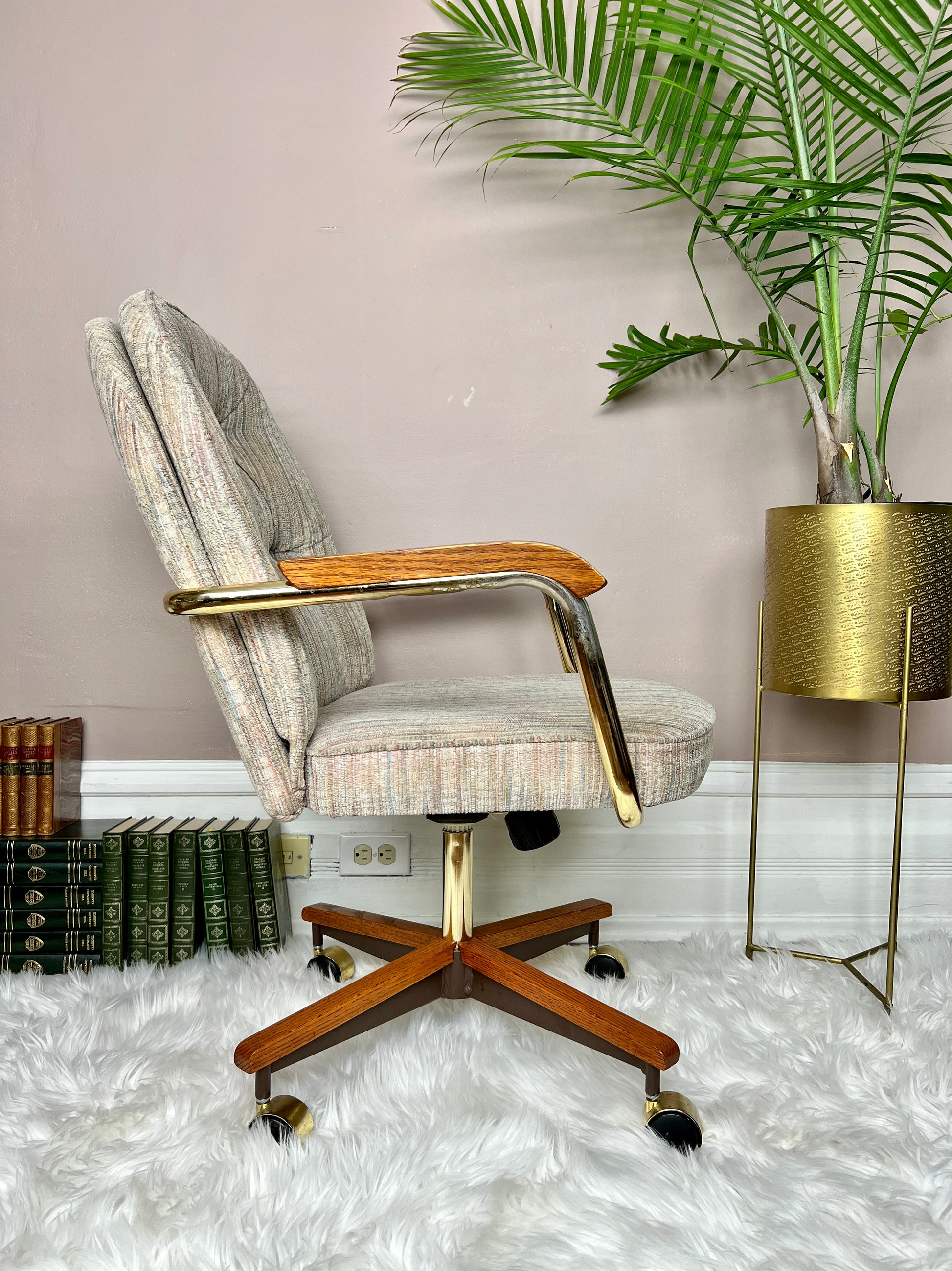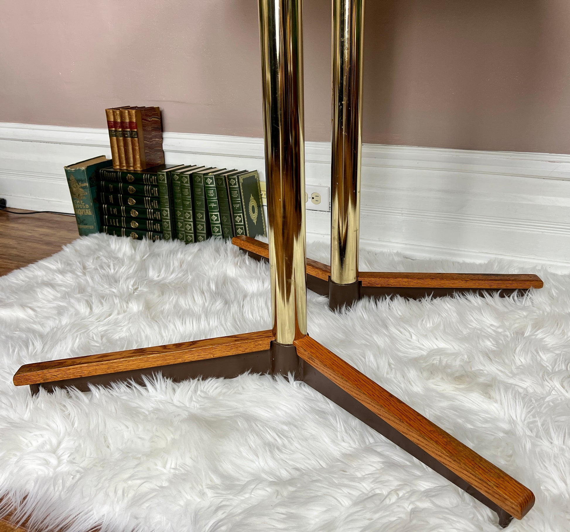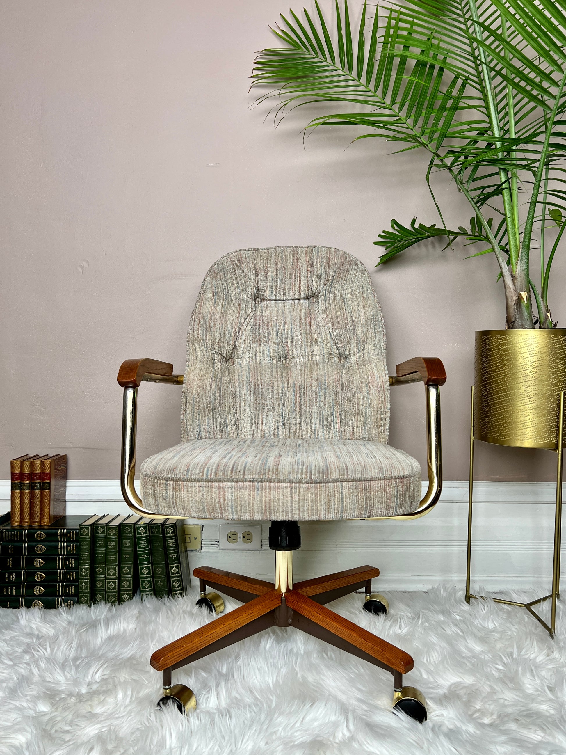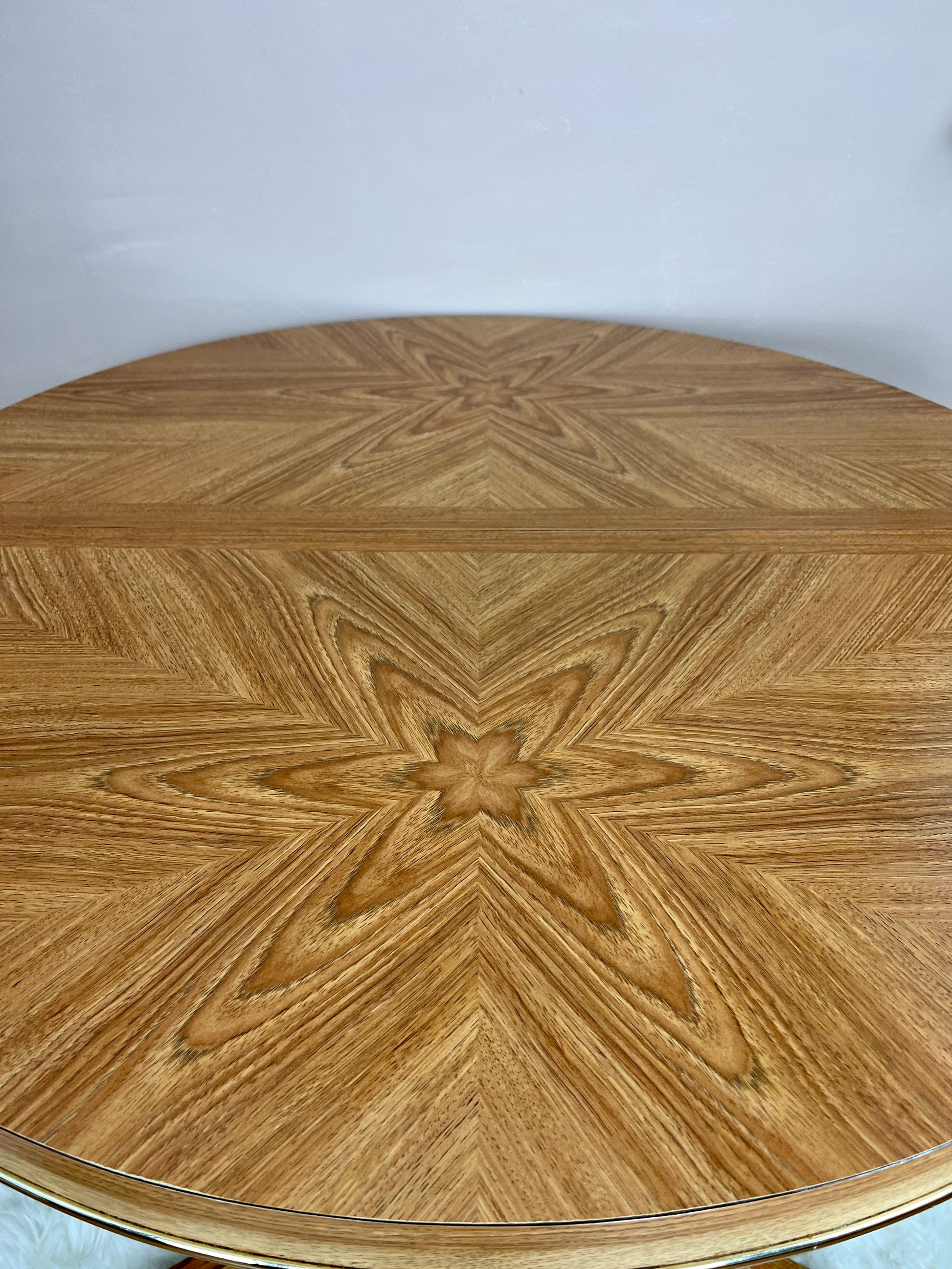 This 5 piece is quite the beauty. Made in Canada & still in great condition, it has solid oak & brass accents, & the table top design is really groovy!