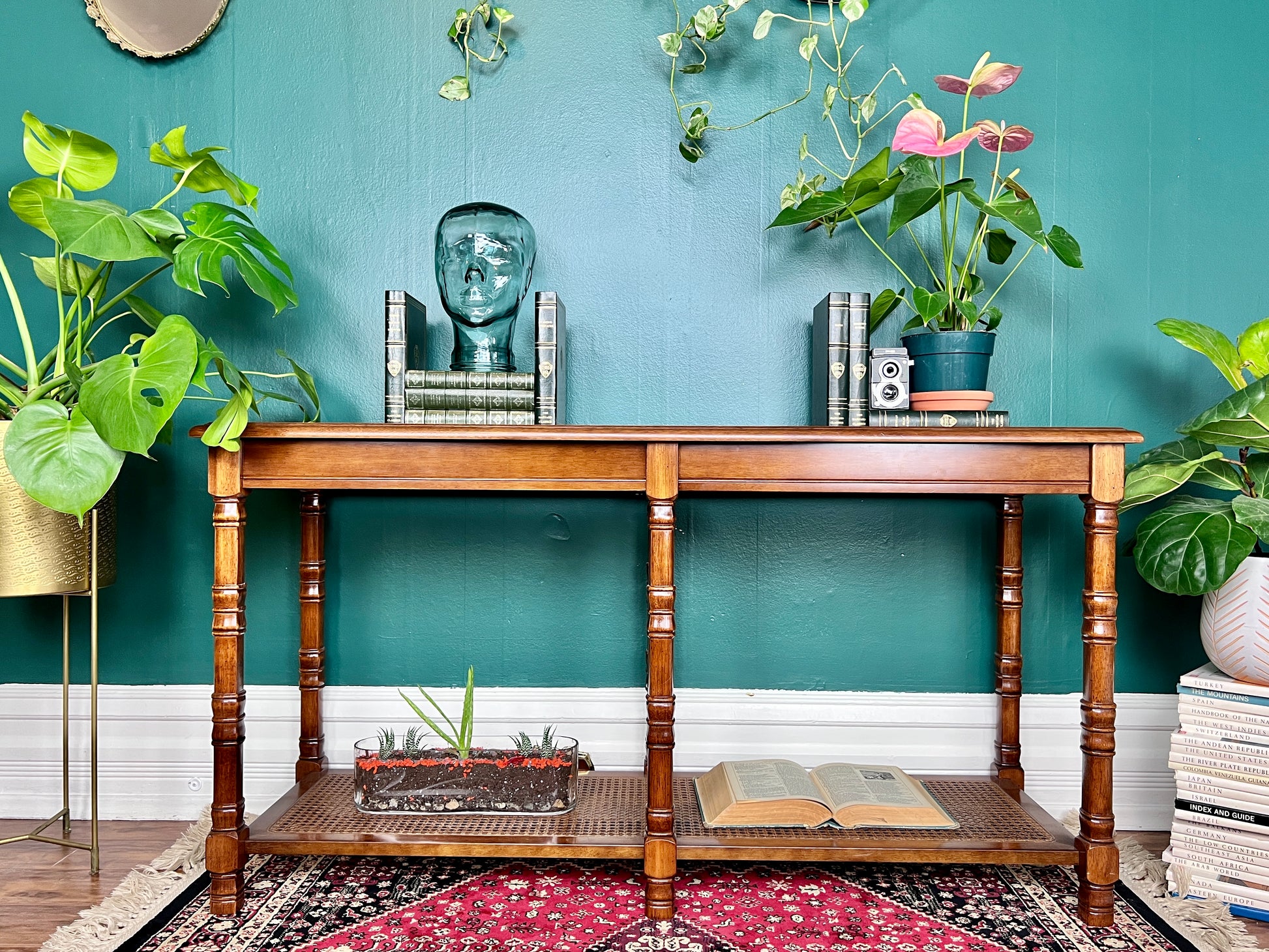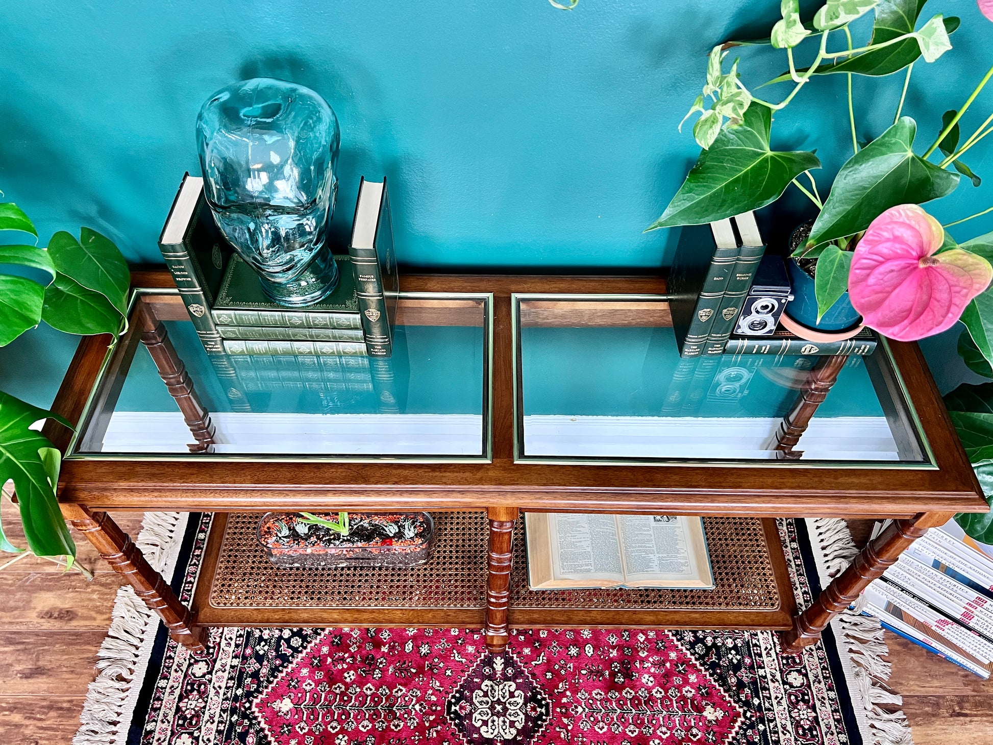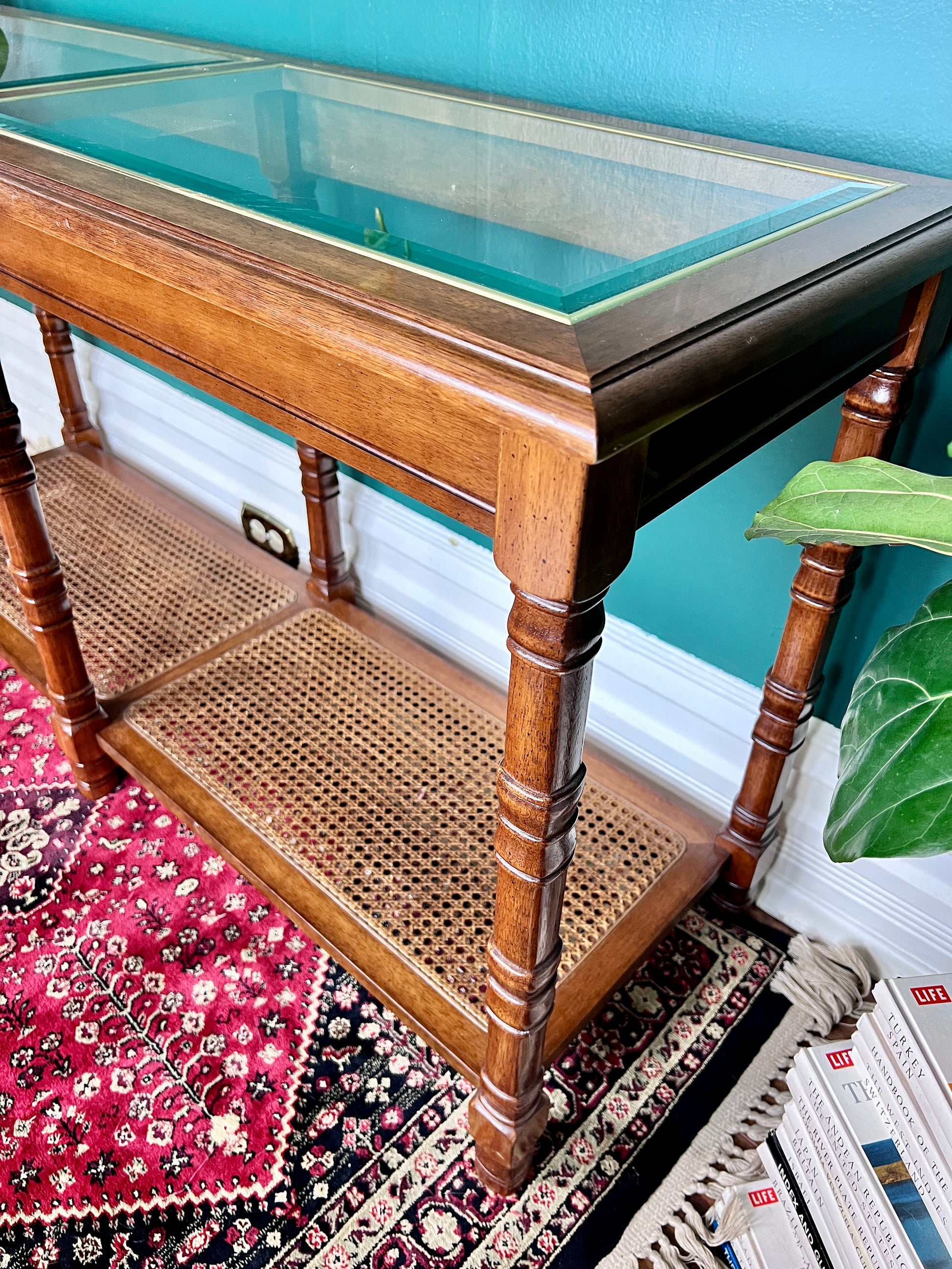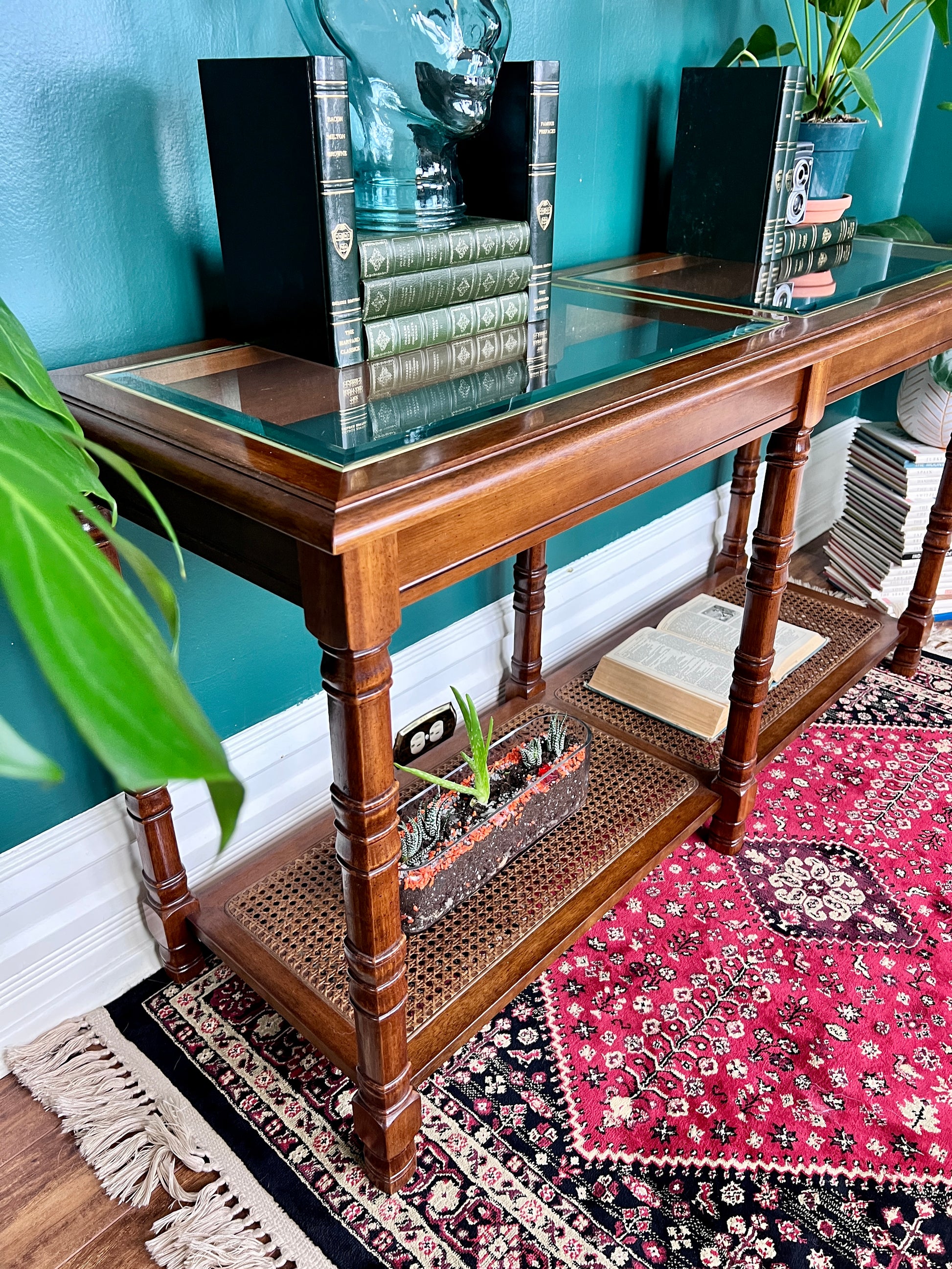 The Crenshaw Hallway Table is the perfect compliment to any & every way of halls. This beauty has glass top inserts with cane bottoms and it's just a delight to look at it! Just look at the beautiful wood patterns & how the top shines like a magnificent wooden diamond - if there ever was such a thing!