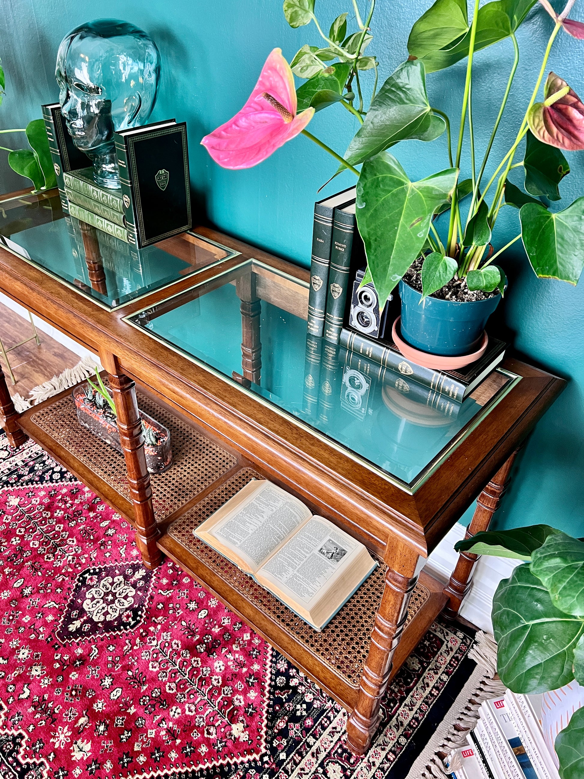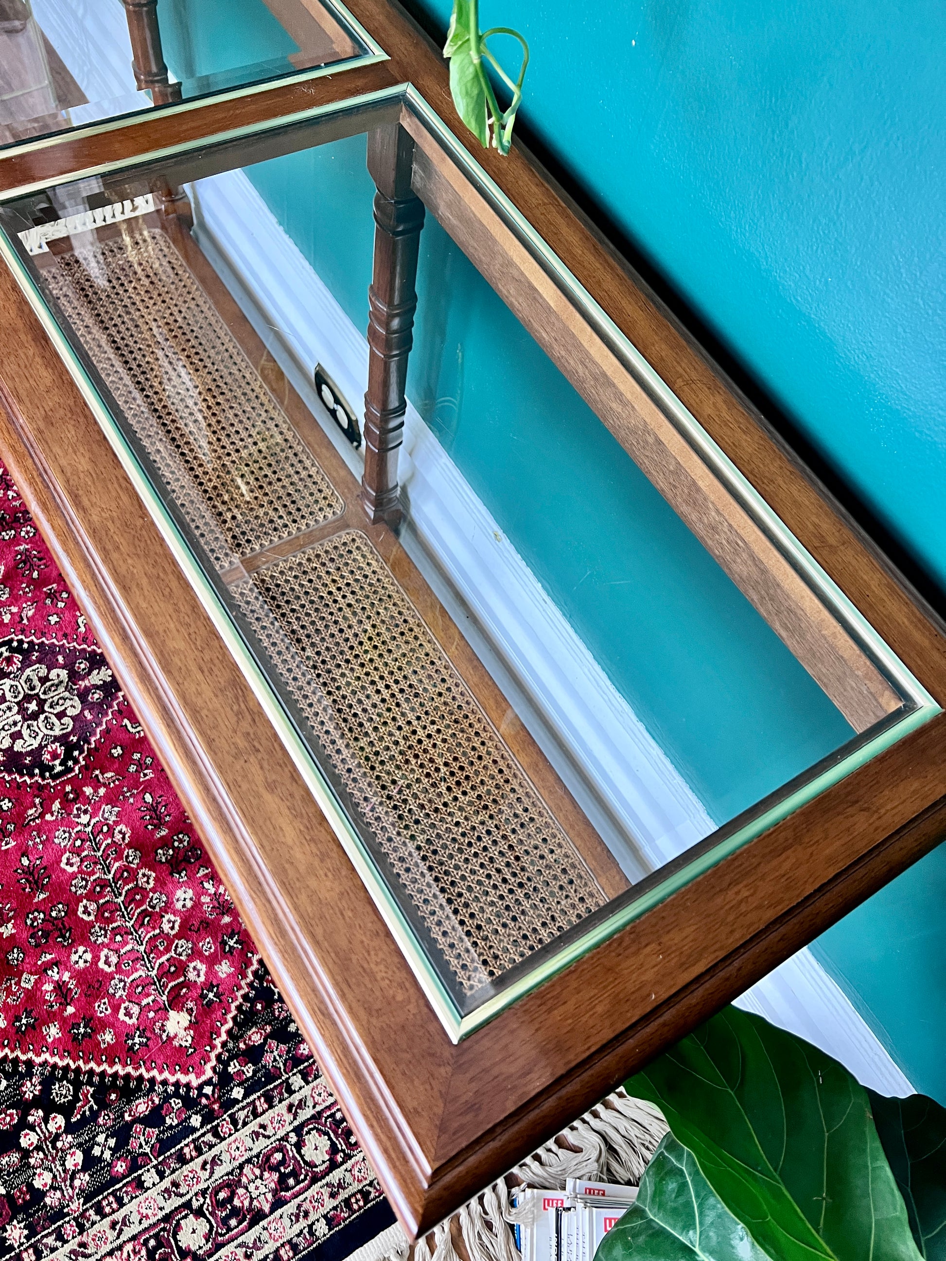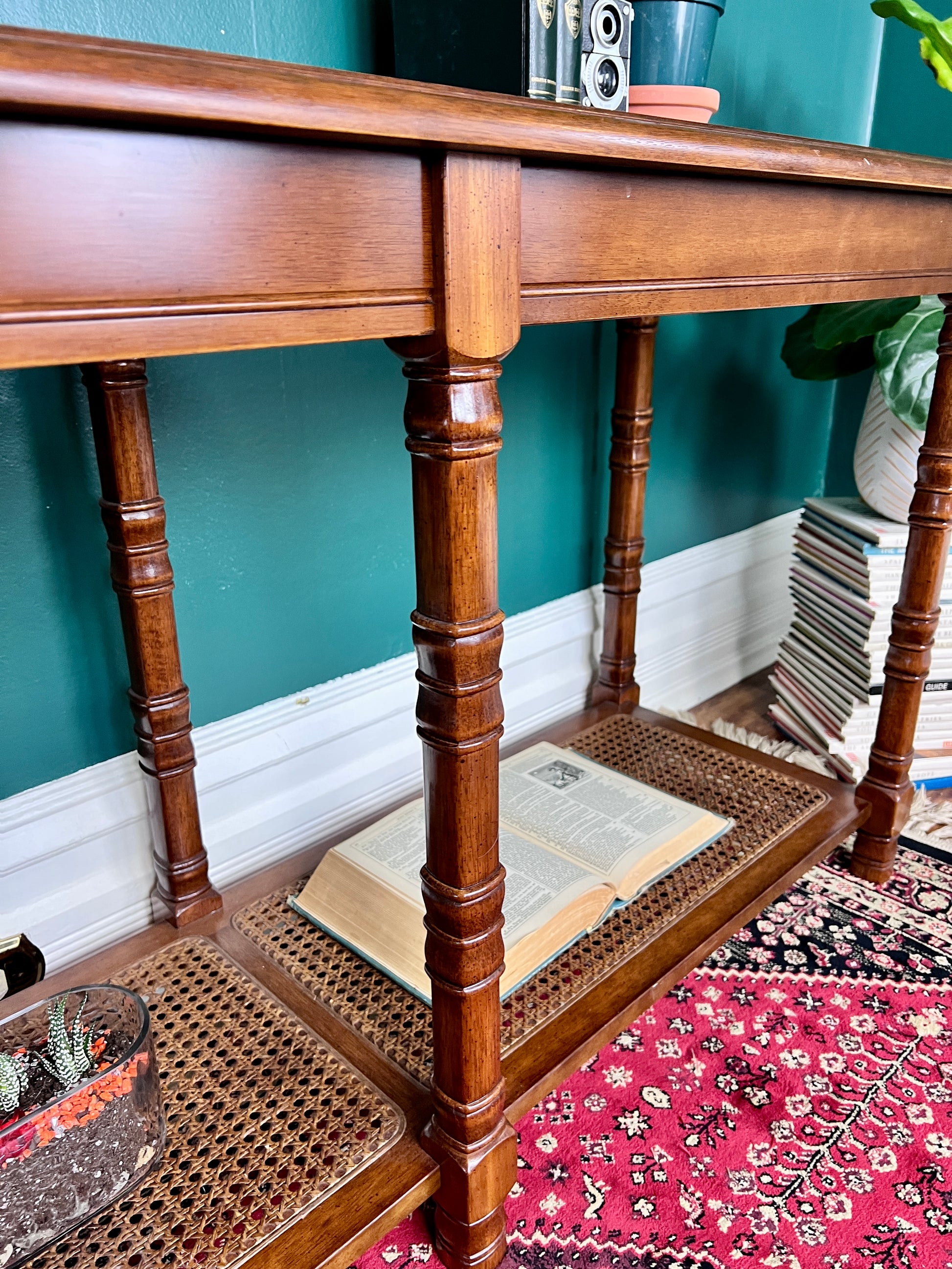 The Crenshaw Hallway Table is the perfect compliment to any & every way of halls. This beauty has glass top inserts with cane bottoms and it's just a delight to look at it! Just look at the beautiful wood patterns & how the top shines like a magnificent wooden diamond - if there ever was such a thing!