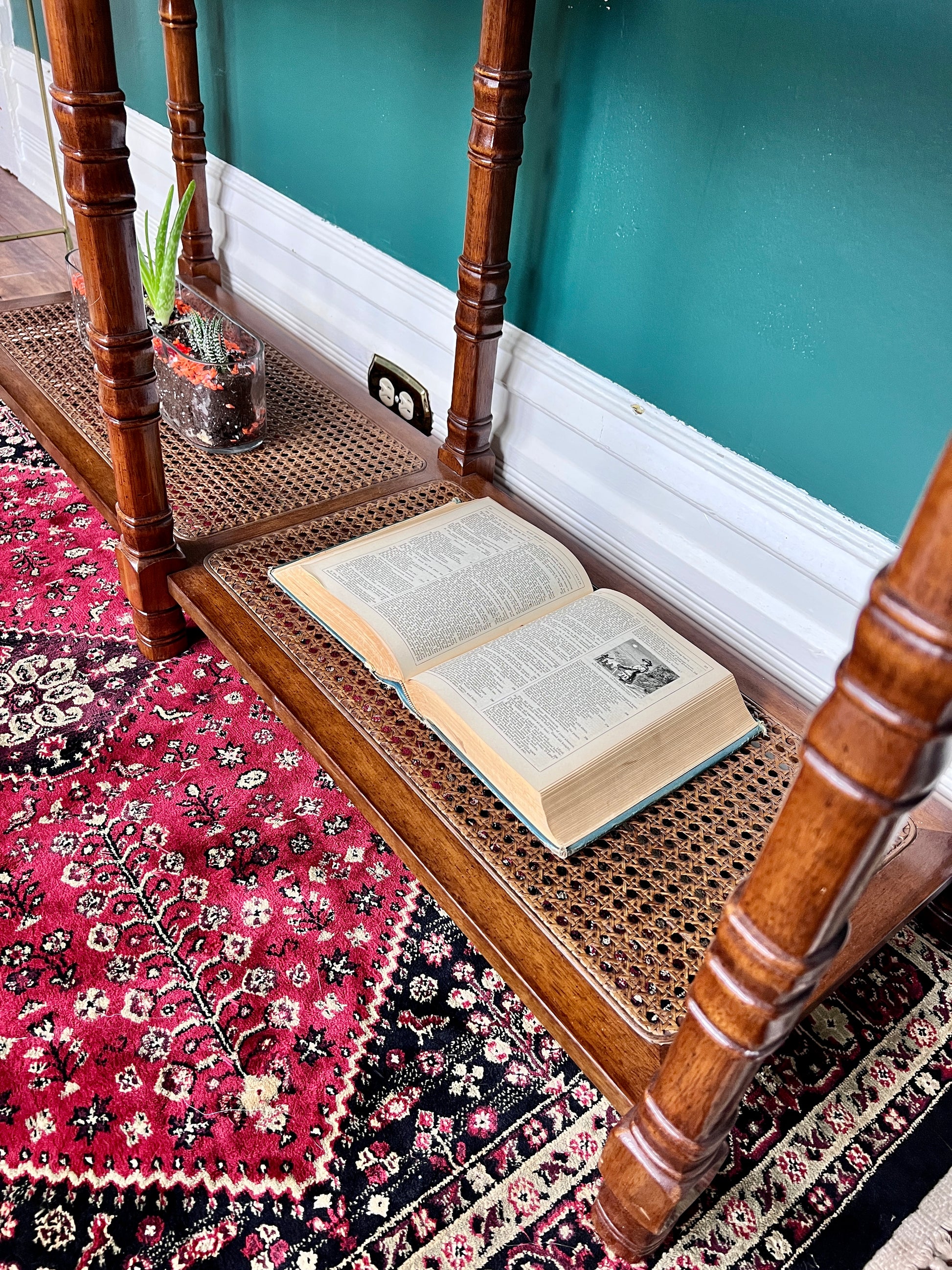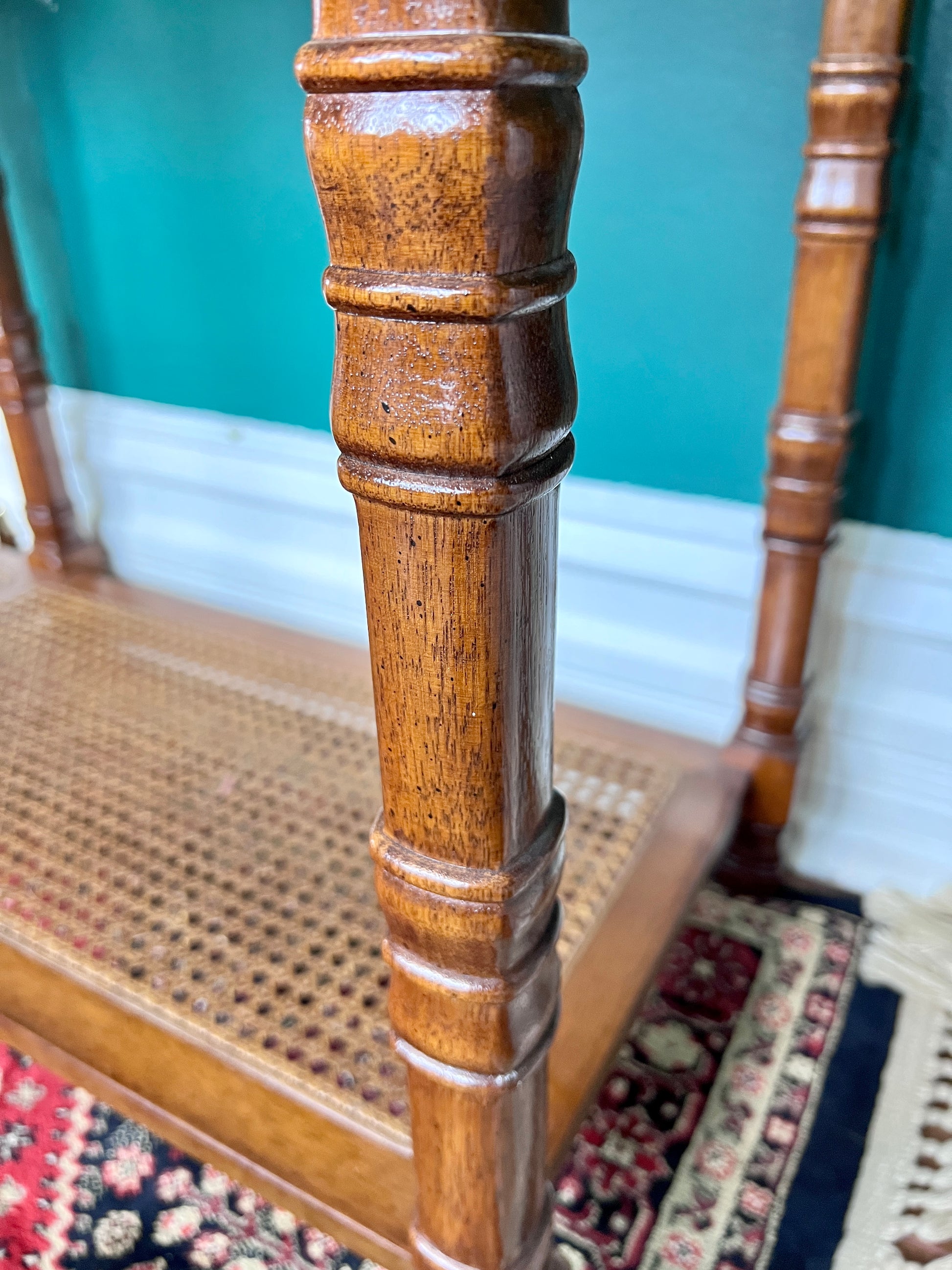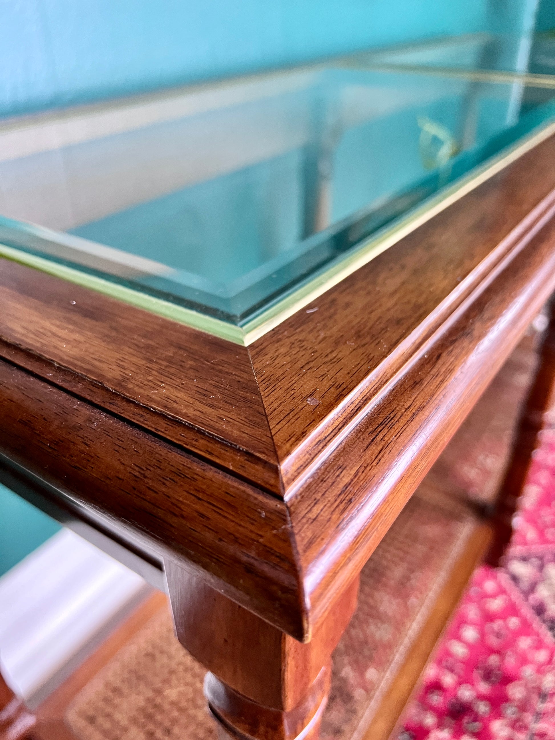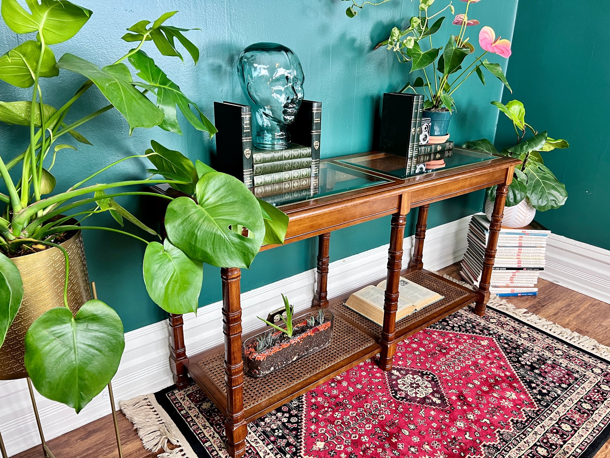 The Crenshaw Hallway Table is the perfect compliment to any & every way of halls. This beauty has glass top inserts with cane bottoms and it's just a delight to look at it! Just look at the beautiful wood patterns & how the top shines like a magnificent wooden diamond - if there ever was such a thing!
