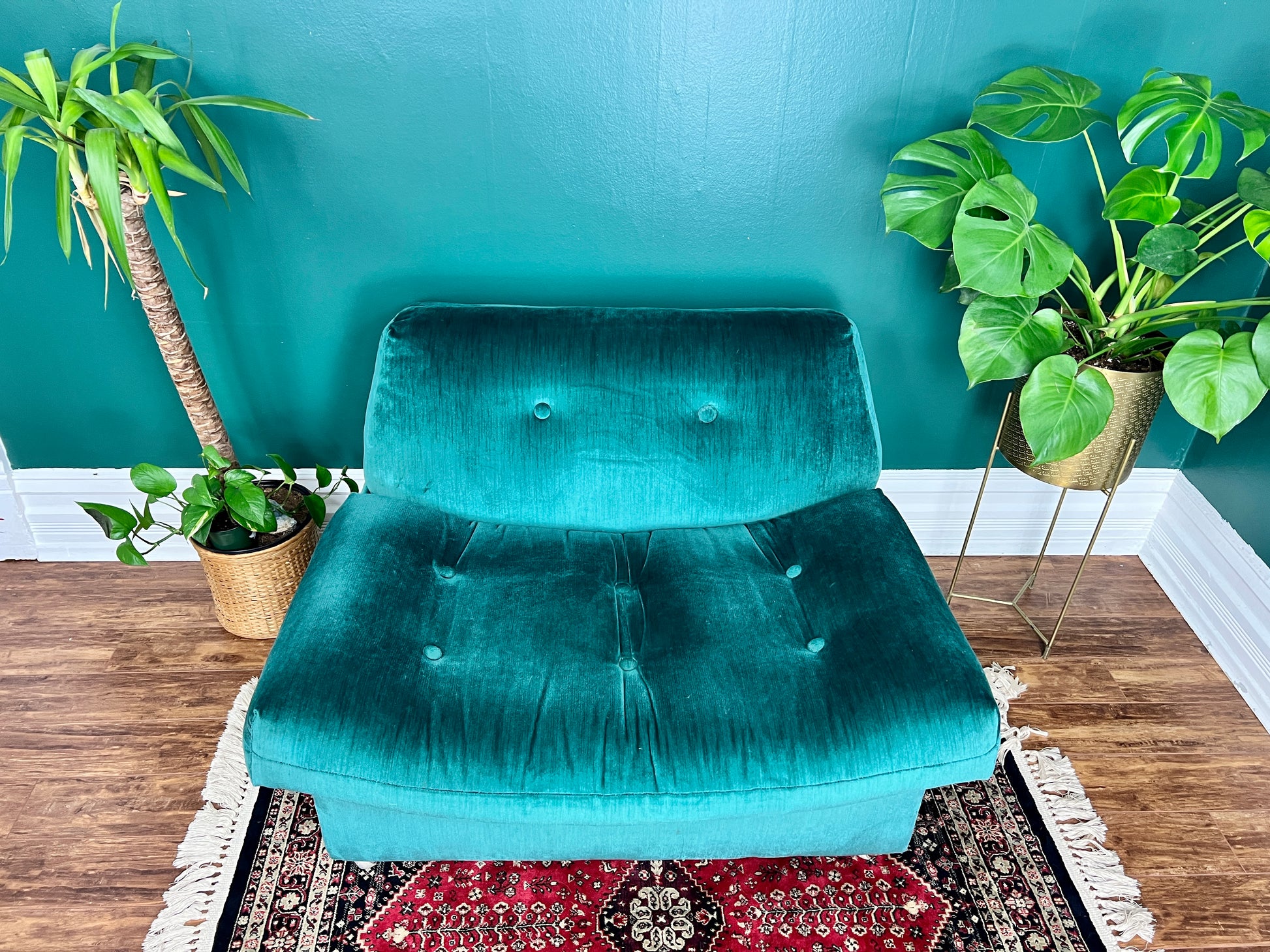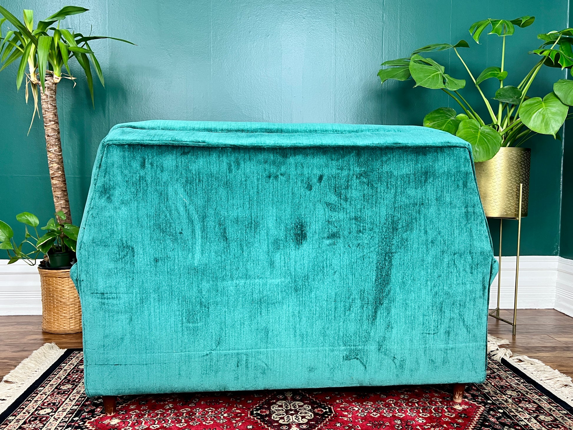 He’s an emerald midcentury style green sofa chair. Not quite big enough to be a sofa & not small enough to be just a chair.