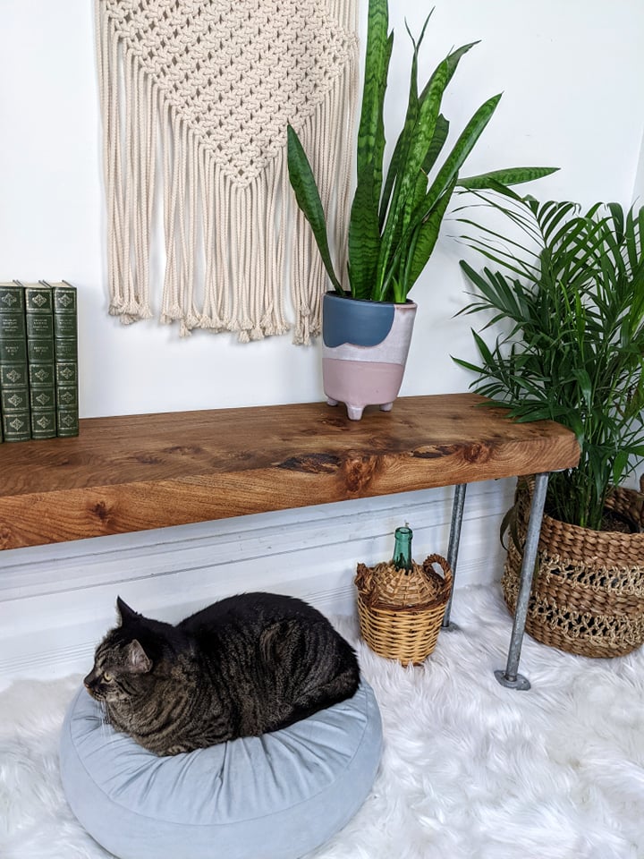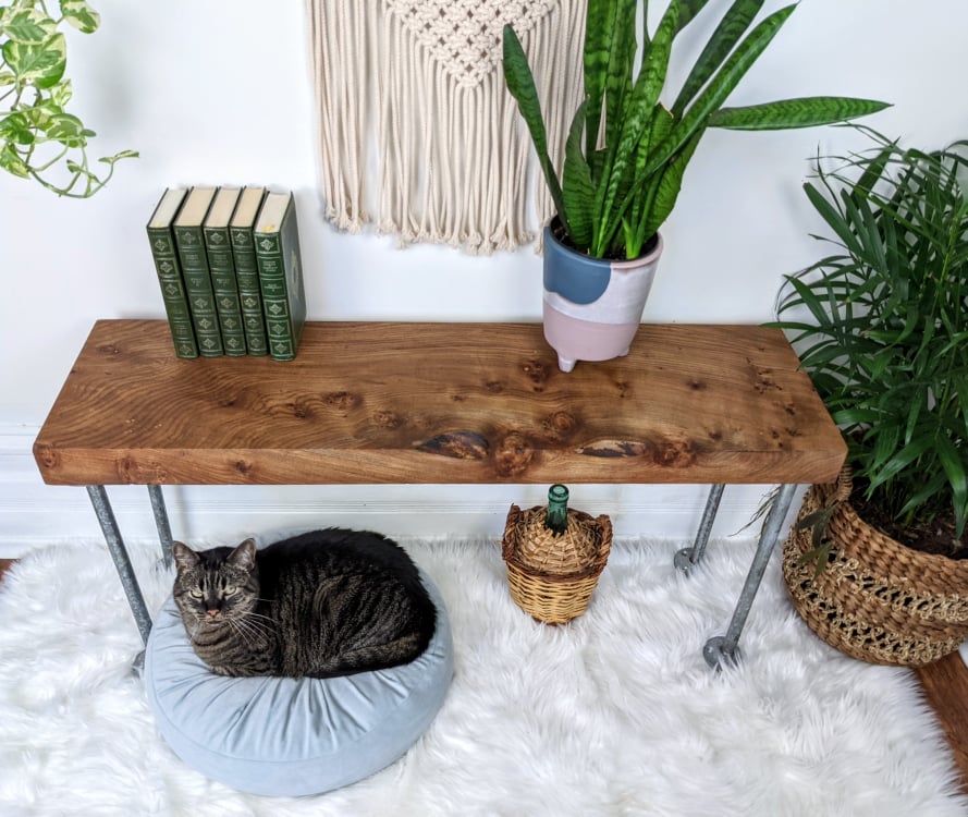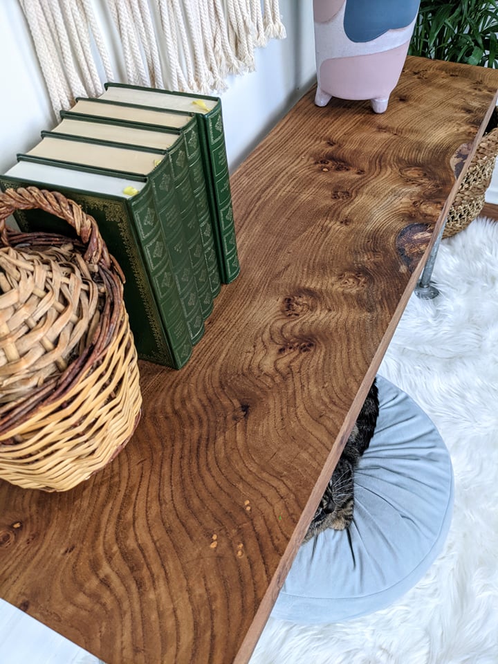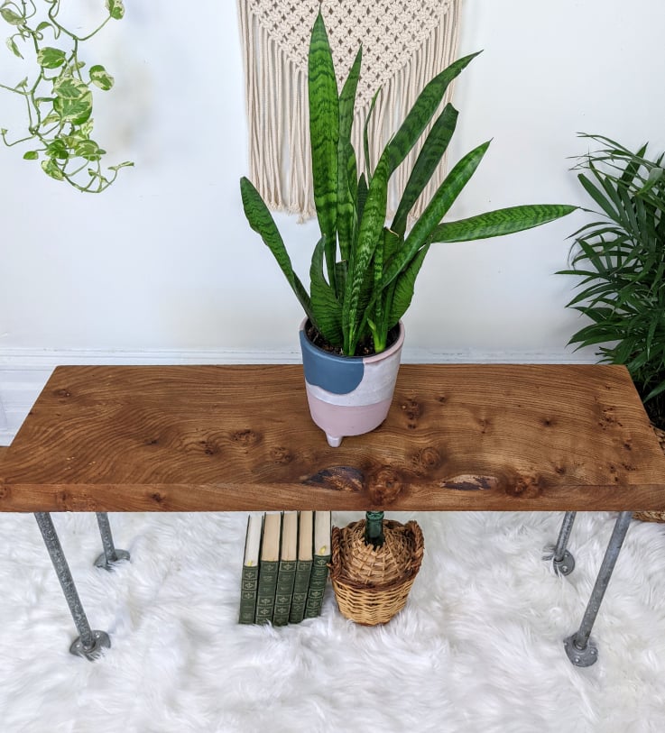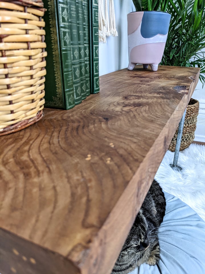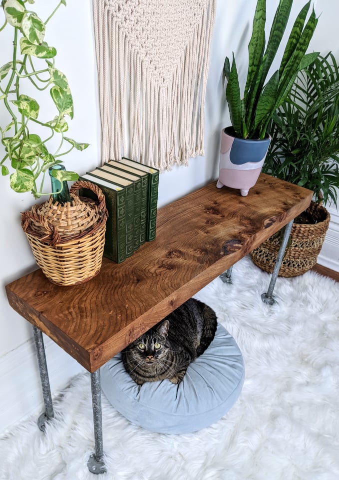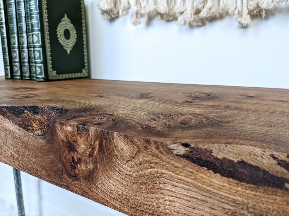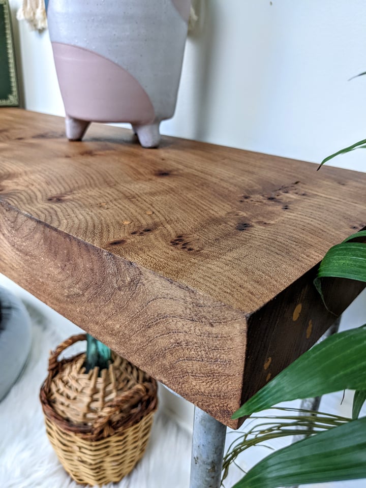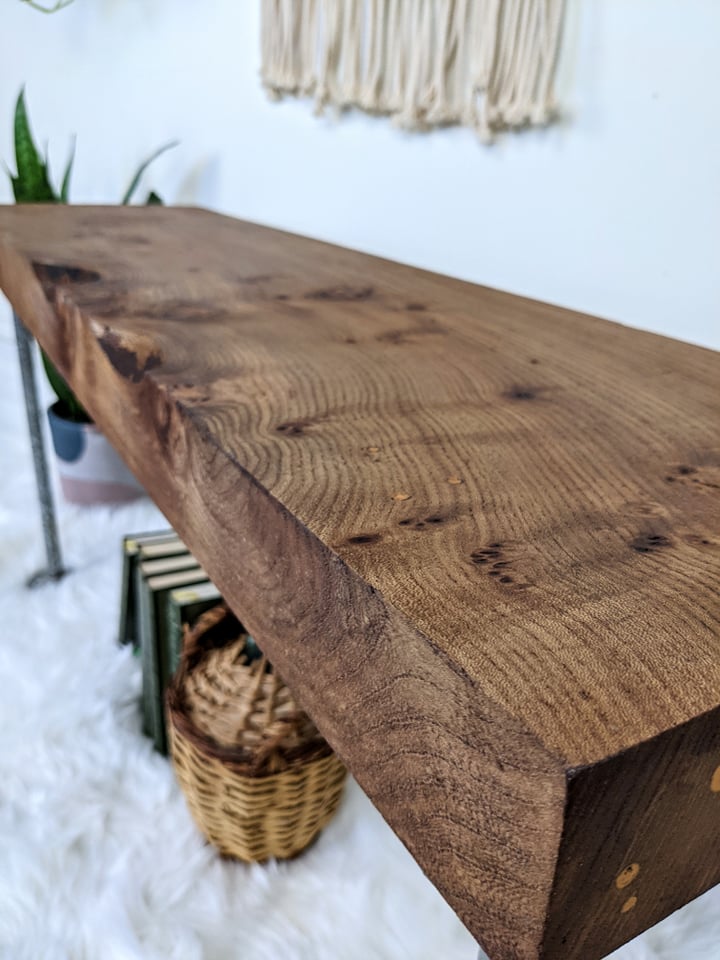 - Rustic table/bench/shelf made from solid live edge elm wood & metal piping