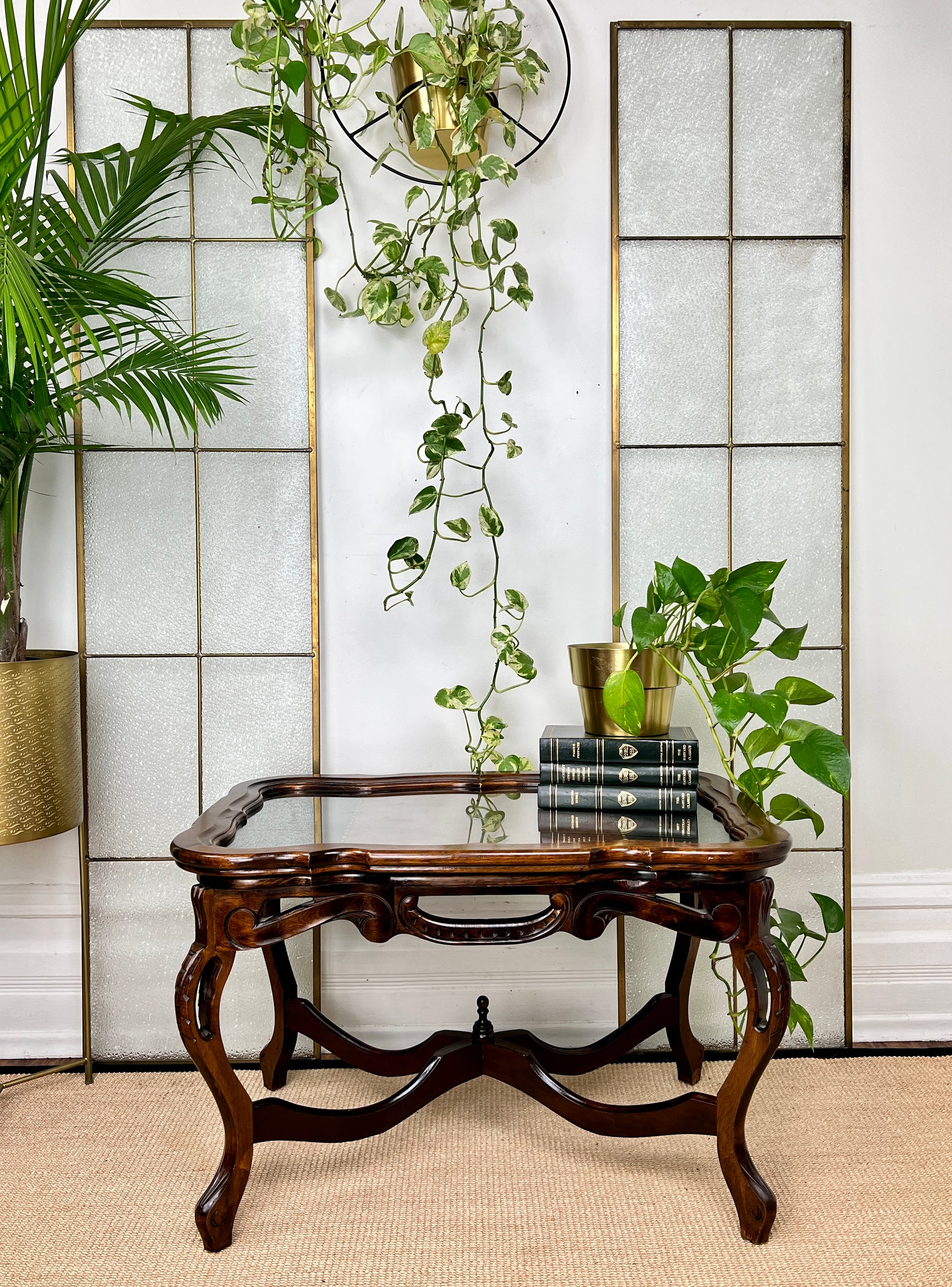 - Antique coffee table with removable glass tray