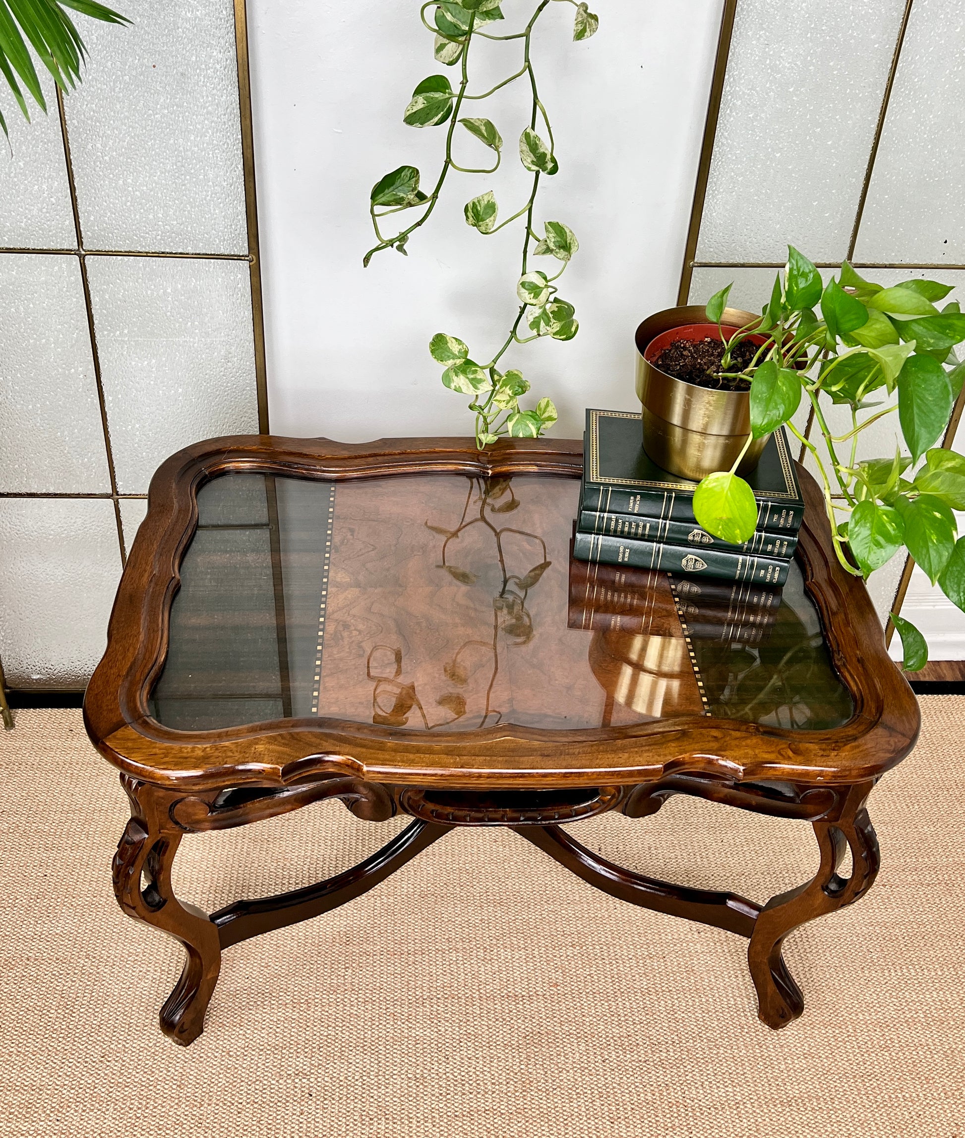 What makes this antique coffee table really special is not its beautifully hand carved legs, or stunning multi-toned grain on the top - it's the removable glass tray. You'll definitely be able to bring your loved one(s) breakfast in bed now - even if your loved one is yourself ;)