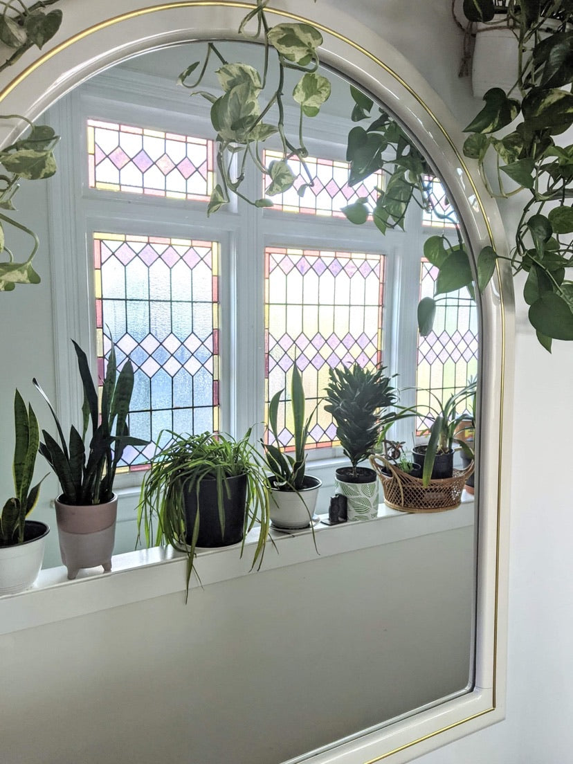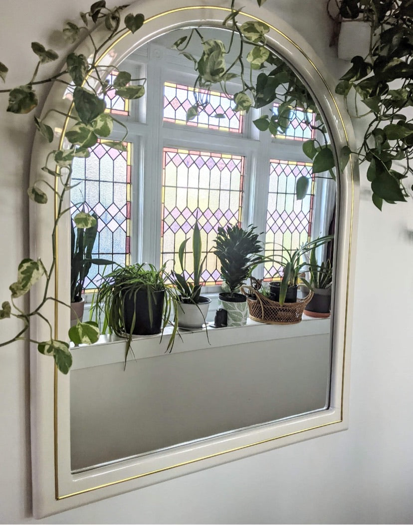 This mirror is quite the beauty I must say! It has that retro-modern aesthetic with its unique shape, cream color & gold accents.