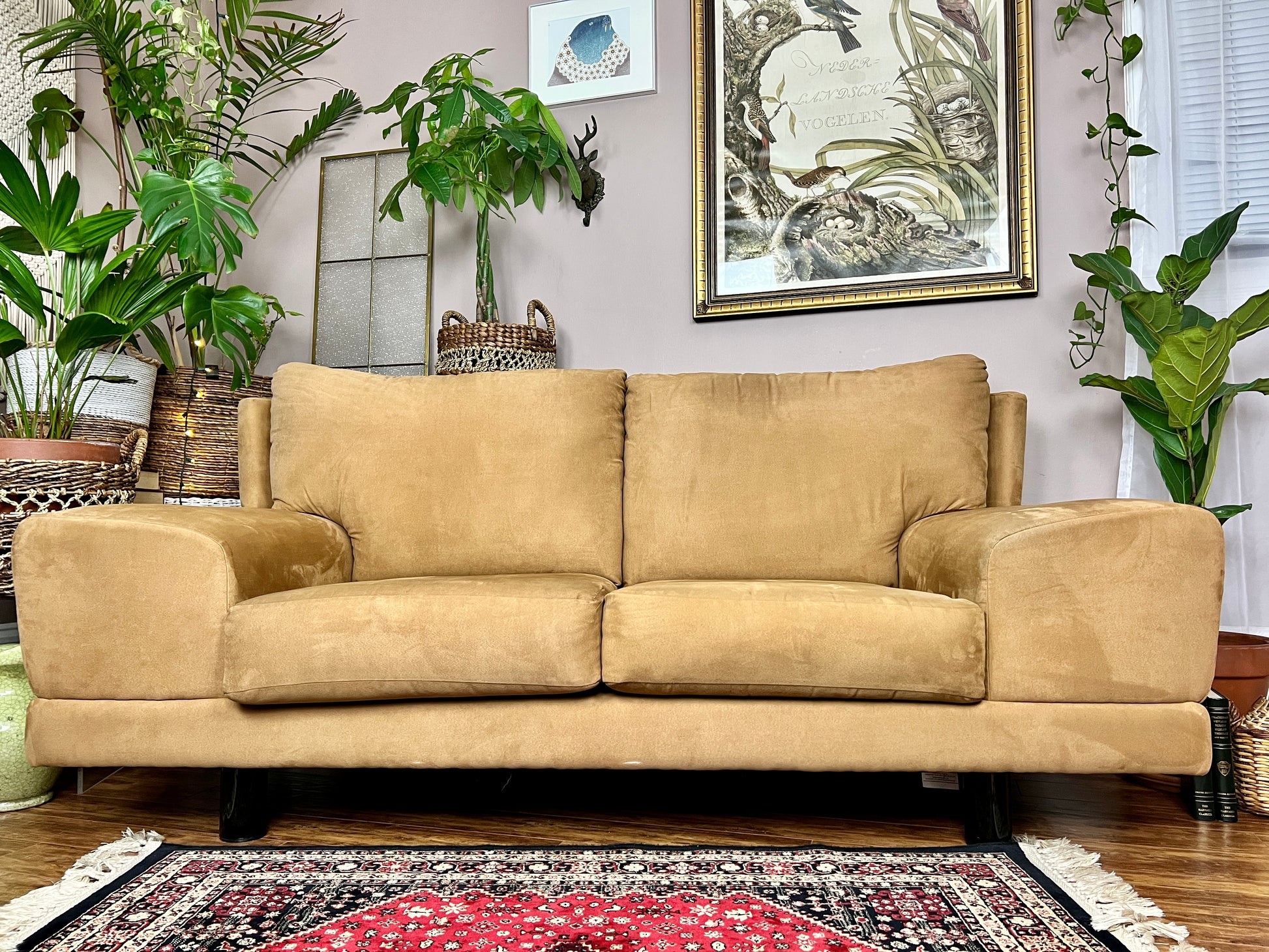 This couch definitely has that mcm flare, with it's unique wide frame, it brings to mind a sandy coloured Cadillac.