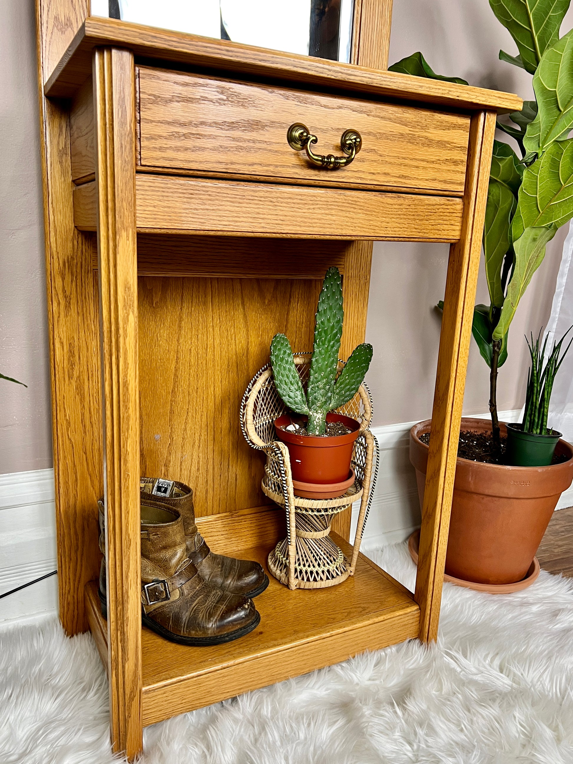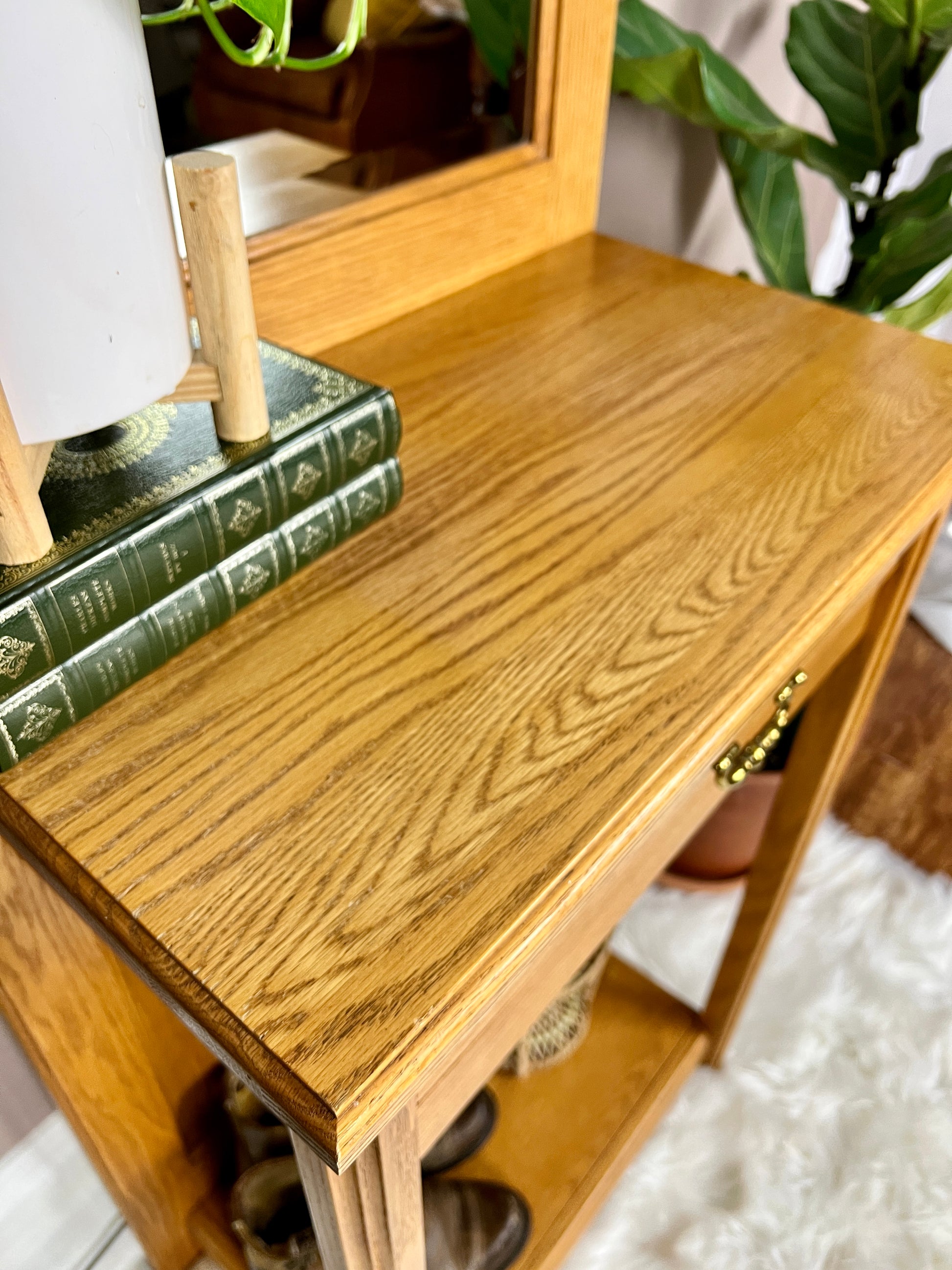 Made from solid oak, featuring a mirror, brass hooks, drawer & lower shelf space - Omari is not only super stylish but very practical as well.