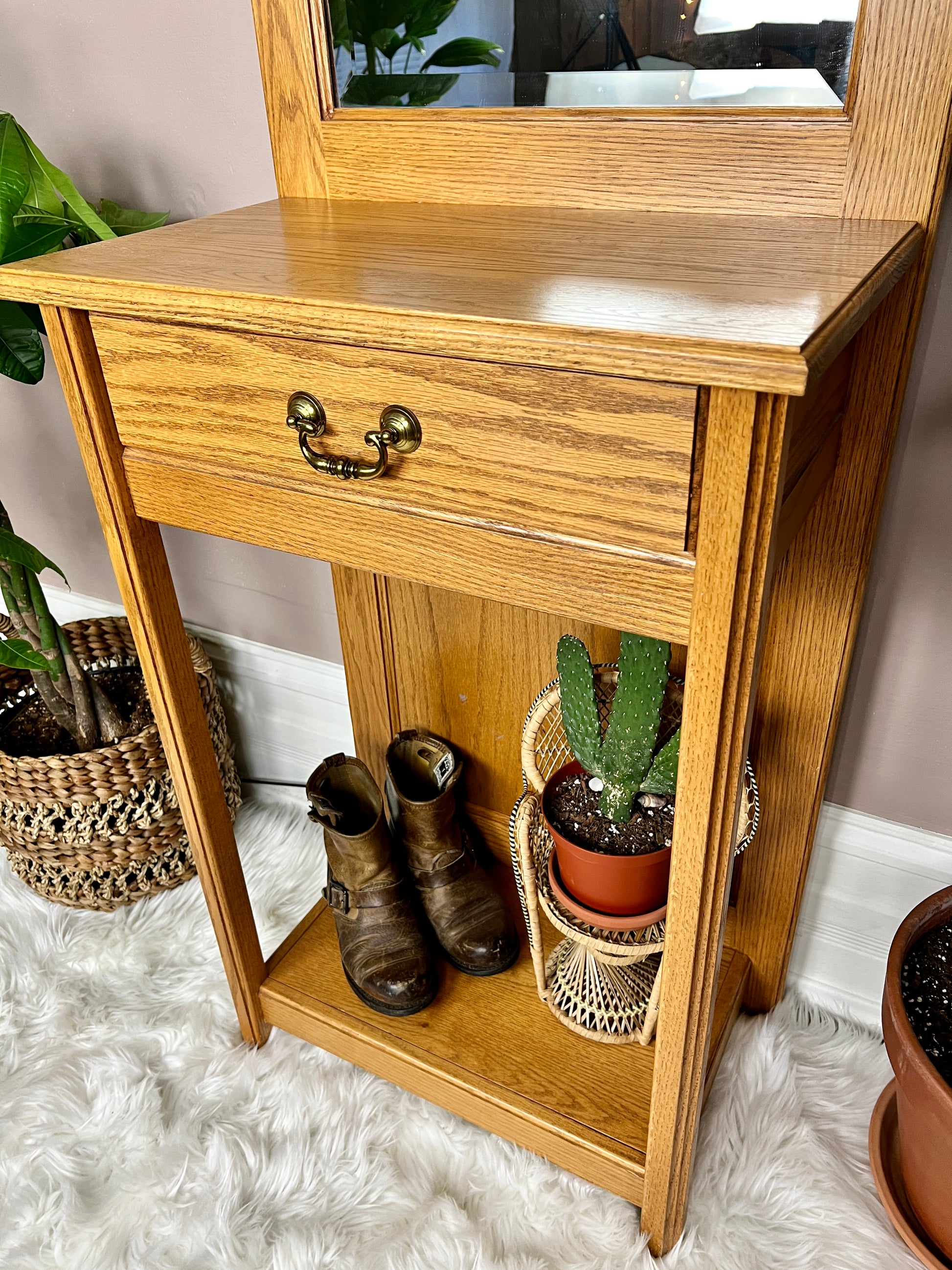 - Features mirror, drawer & 4 brass hooks for hats, scarves & jackets.