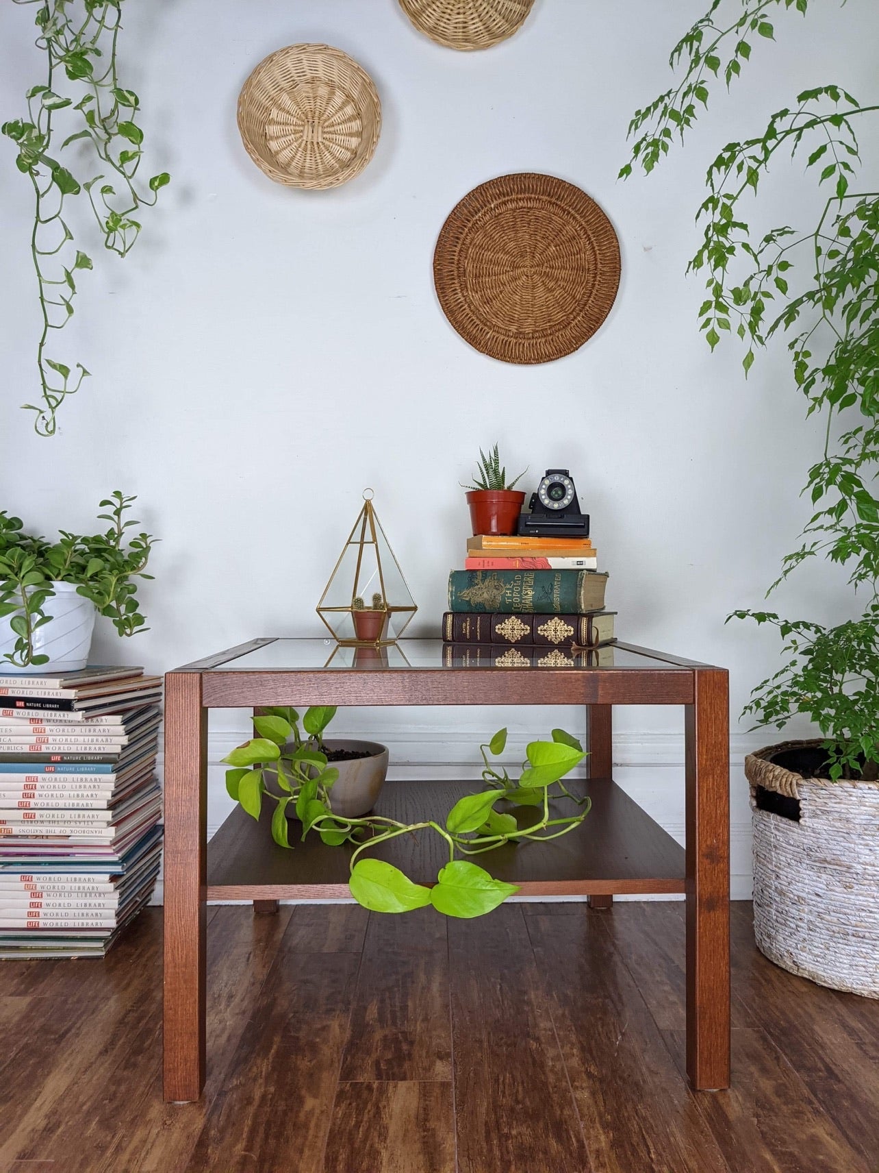 So anyways this table is vintage, it’s wood and glass and it’s got that mid century modern class. So step on the gas, cause you won’t want to miss the chance to own this beauty!