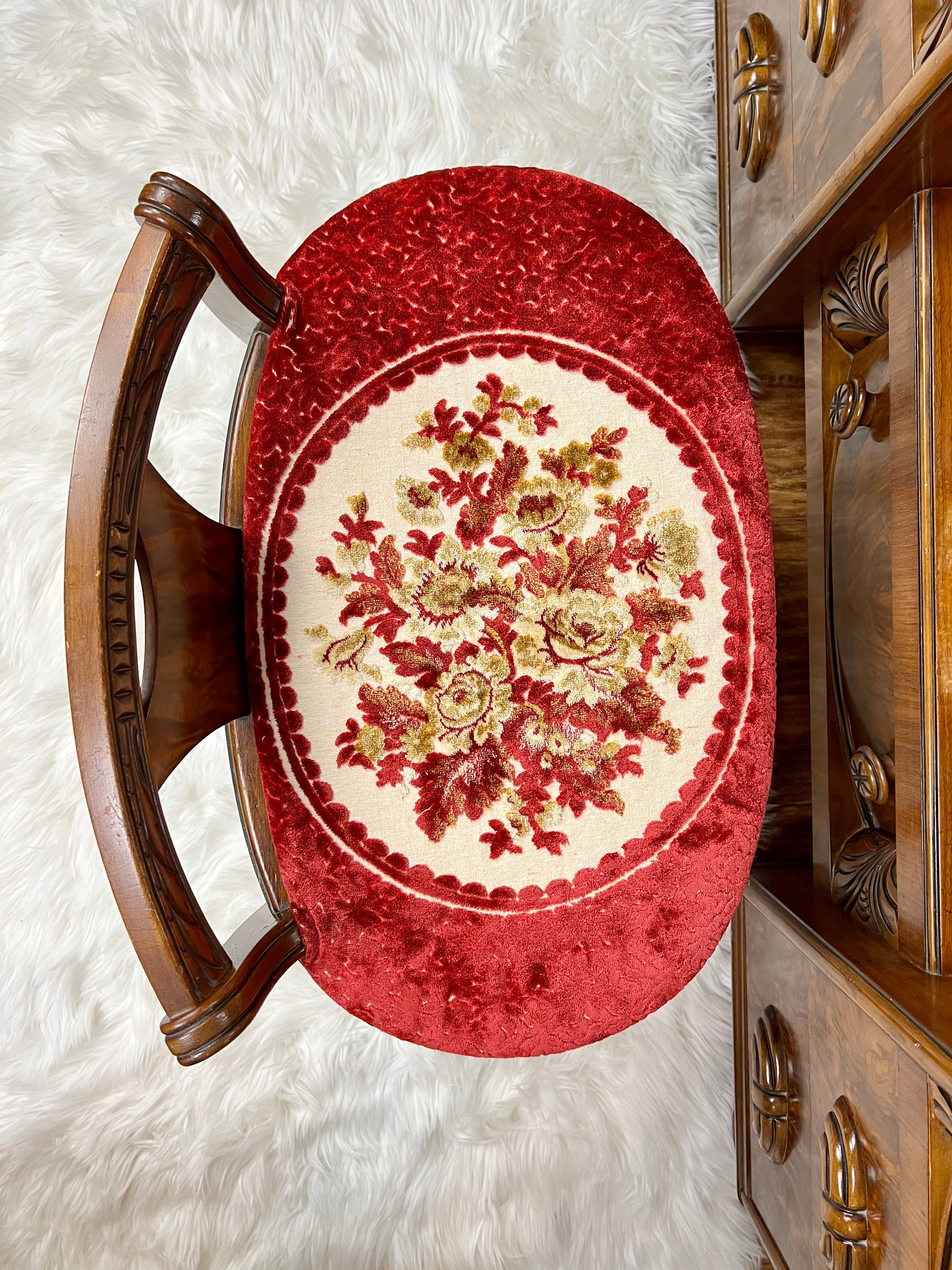 - Chair has been reupholstered with red velvet embroidered with a lovely floral motif