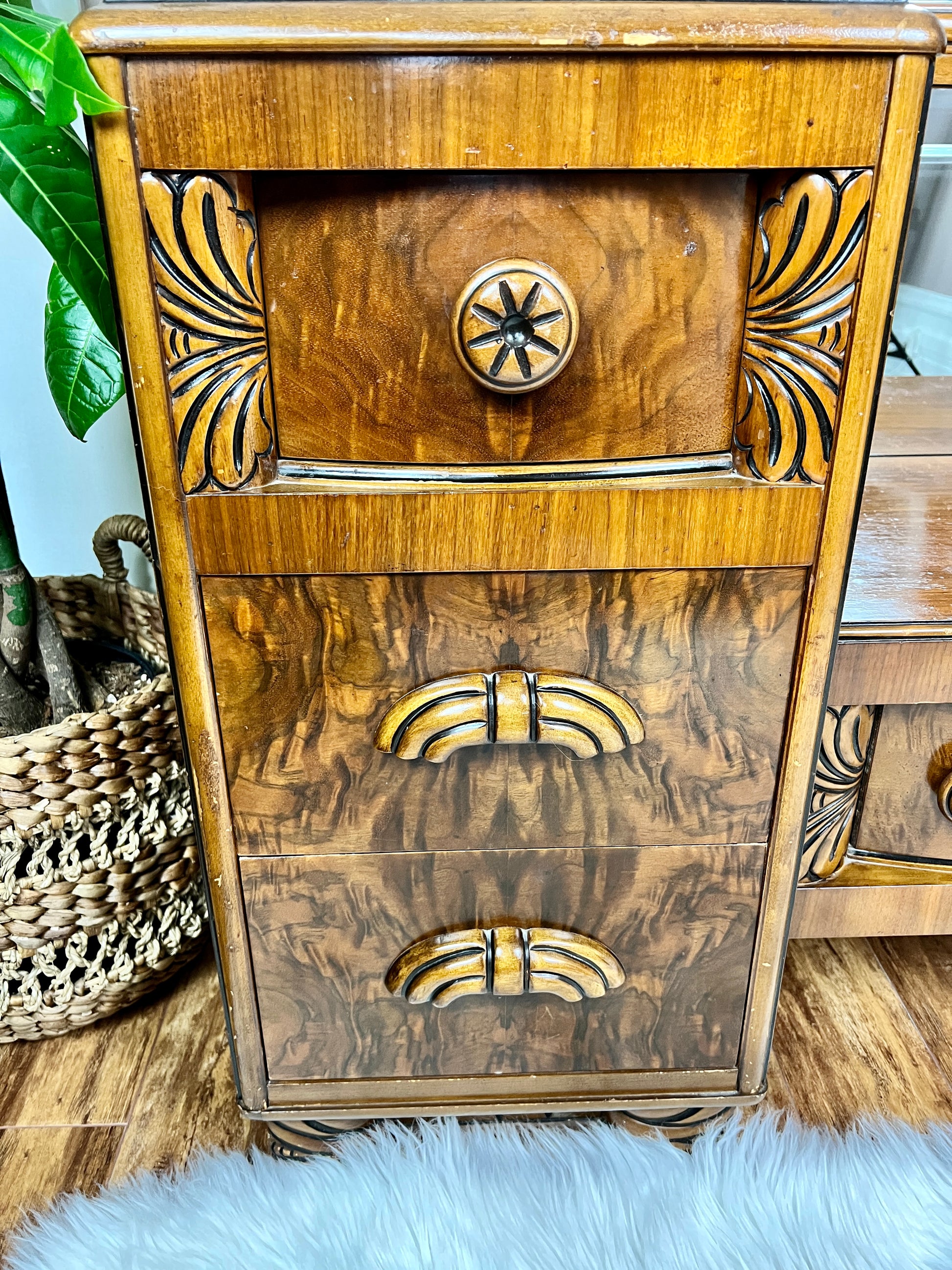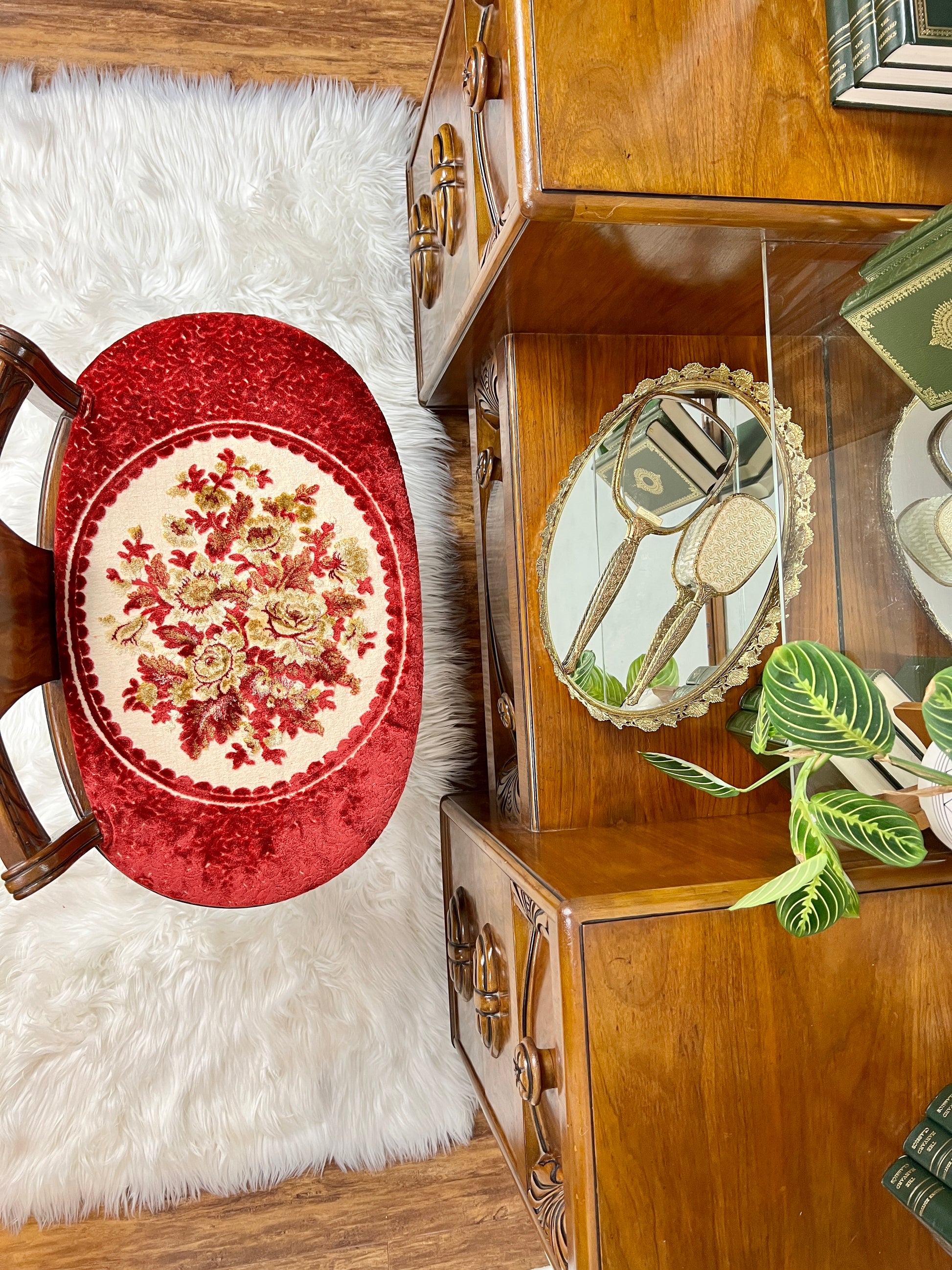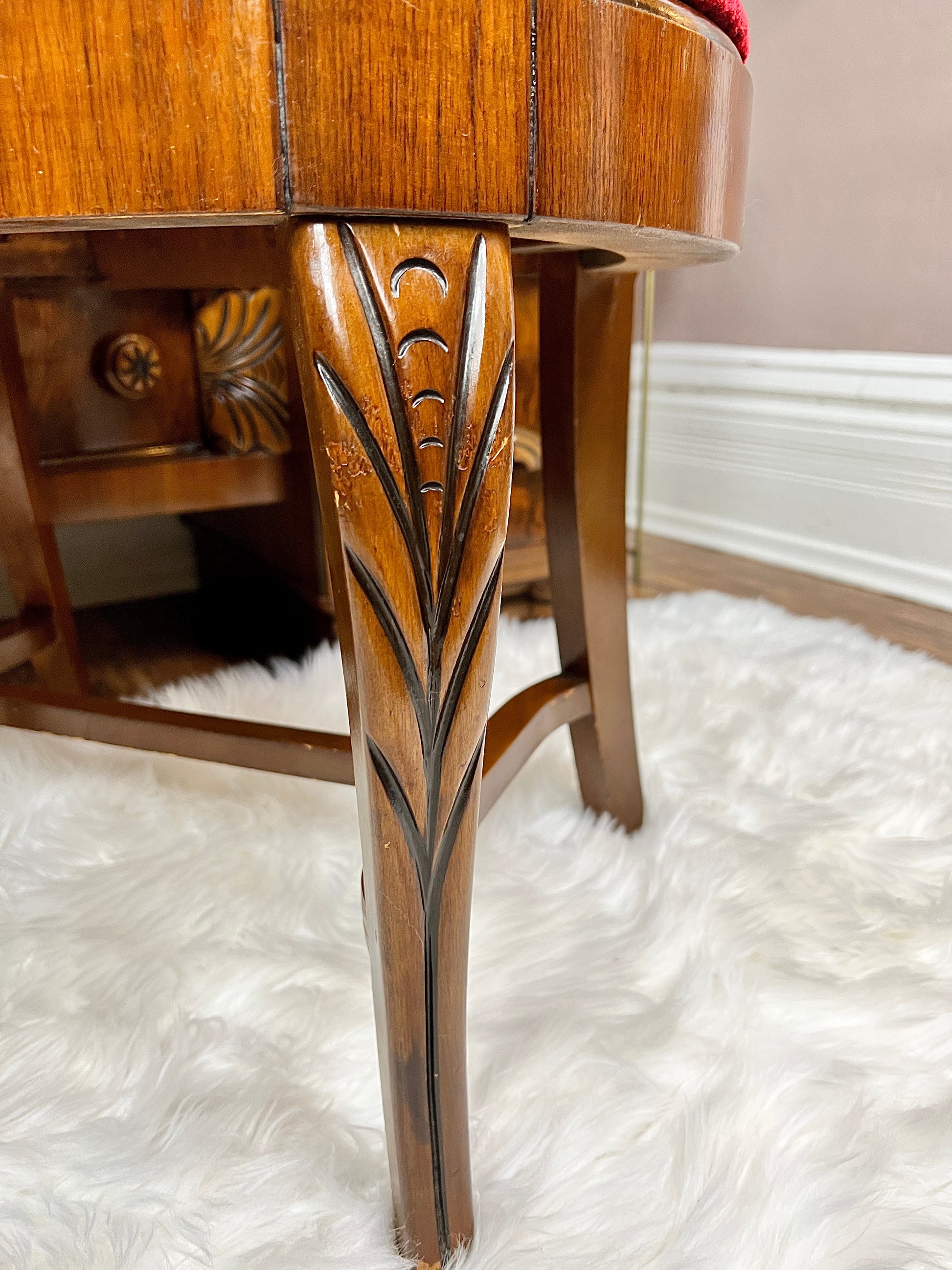 Made from walnut, with dazzling wood grain, delicate details, large mirror, beautiful chair with lovely red velvet upholstery - this antique just overwhelms the senses!