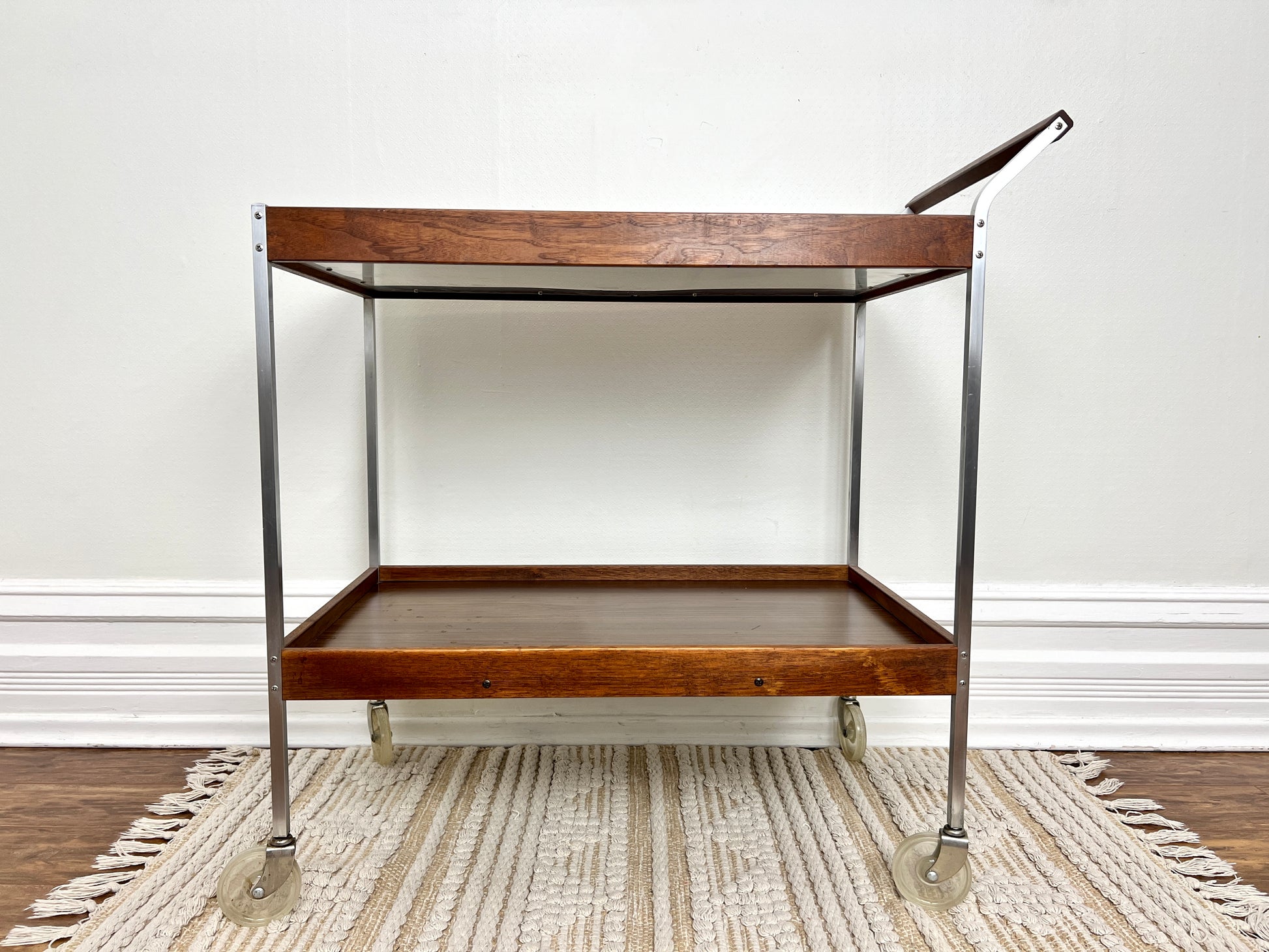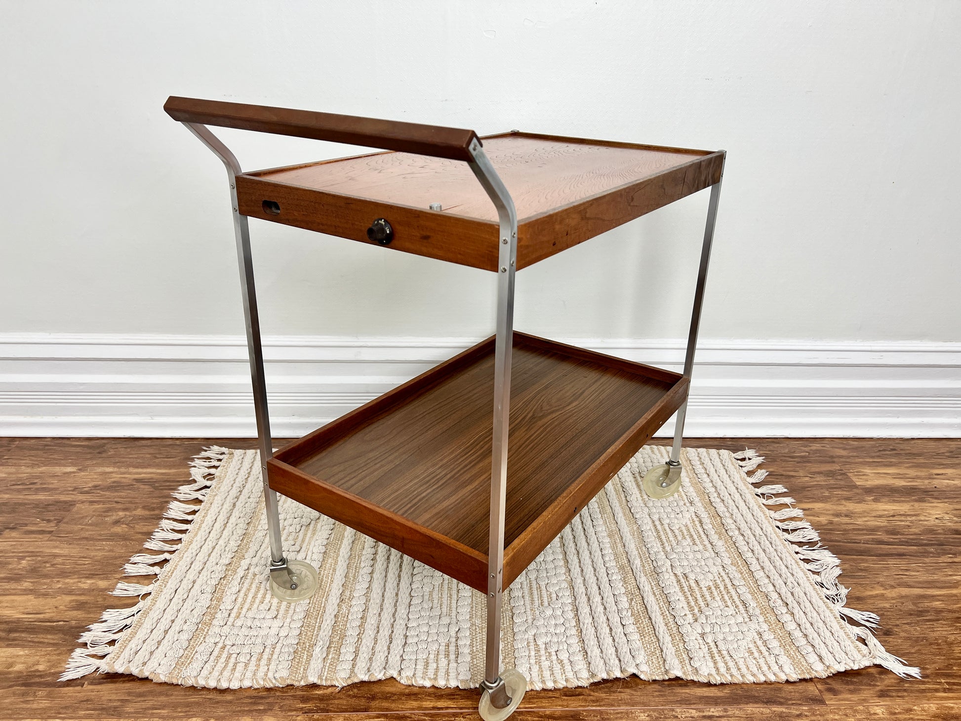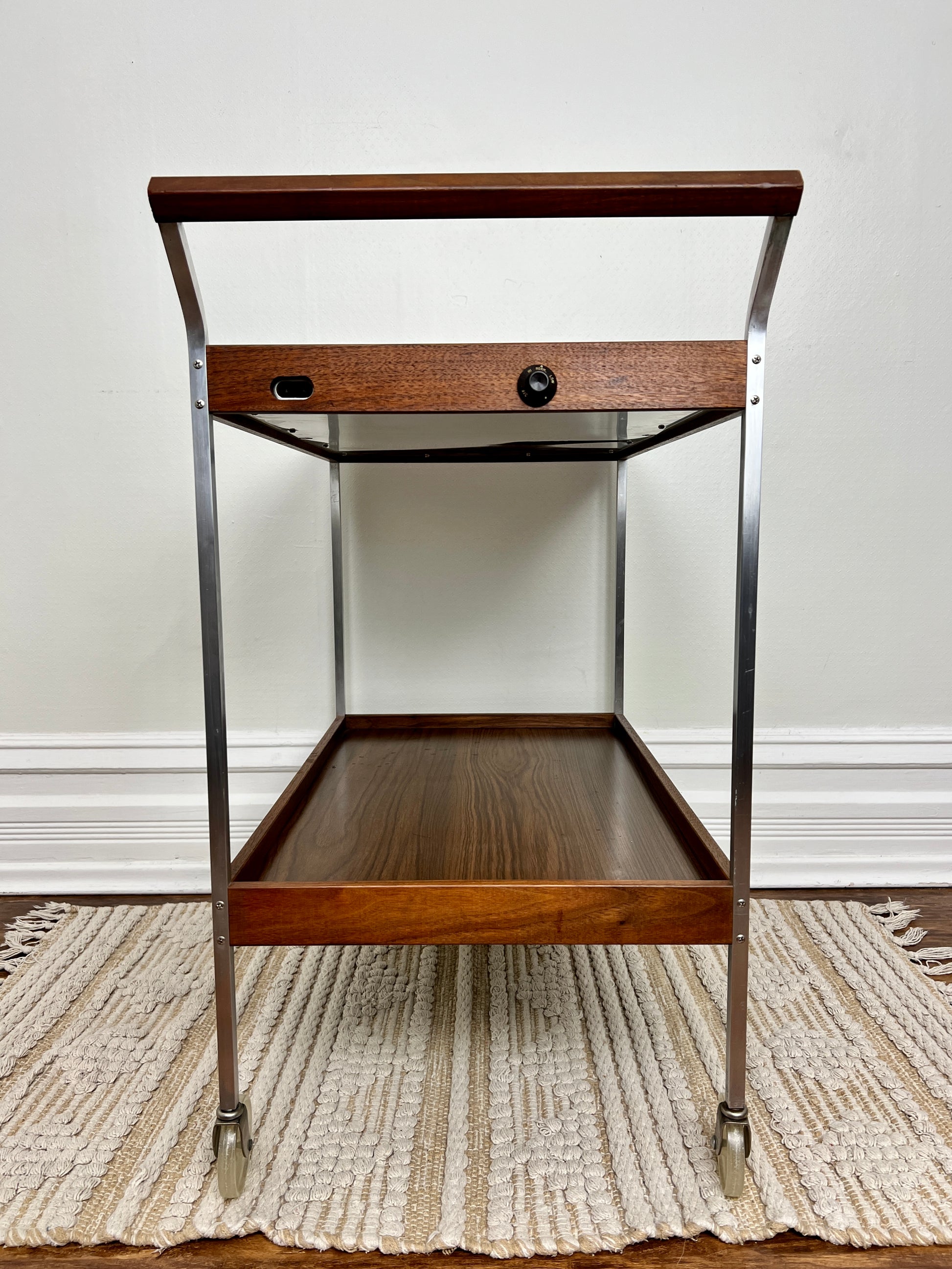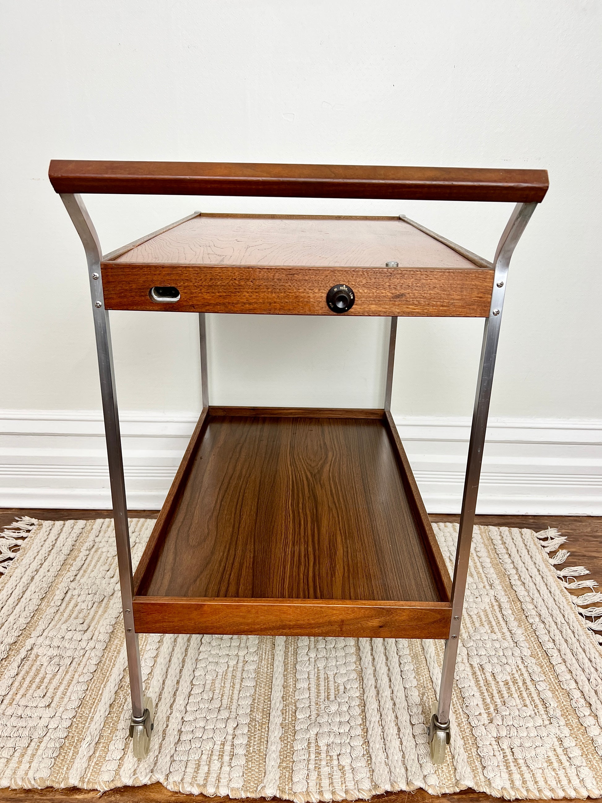 This mcm cart is made of wood, metal & has warming tray that can be adjusted to low, med & hot - so your eggs will never go cold!
