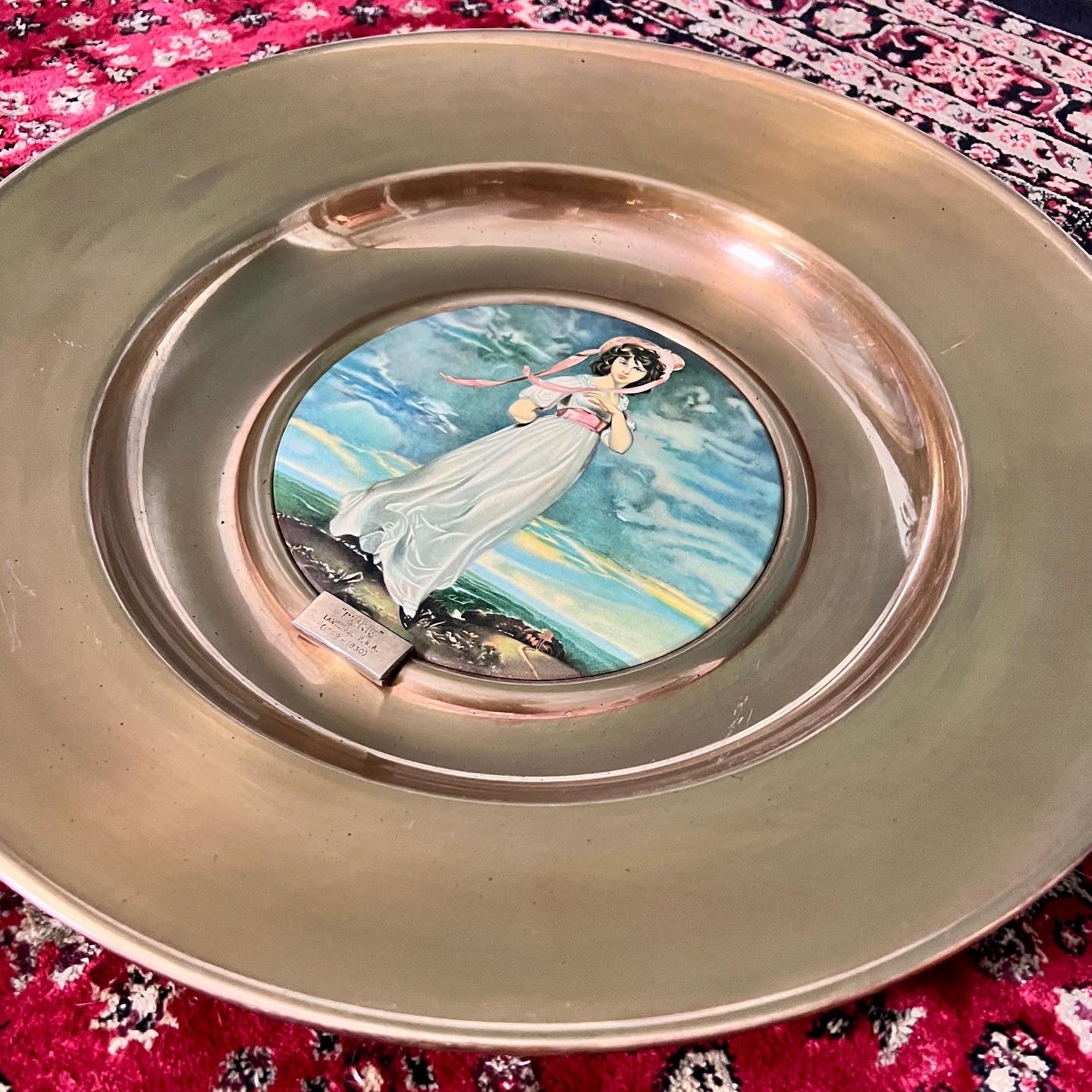 These wonderful brass plates are probably from between 1900 - 1910 and was made in England. It pictures a young man on the moors in a period outfit with his cape in one arm and hat and feather in the other hand.