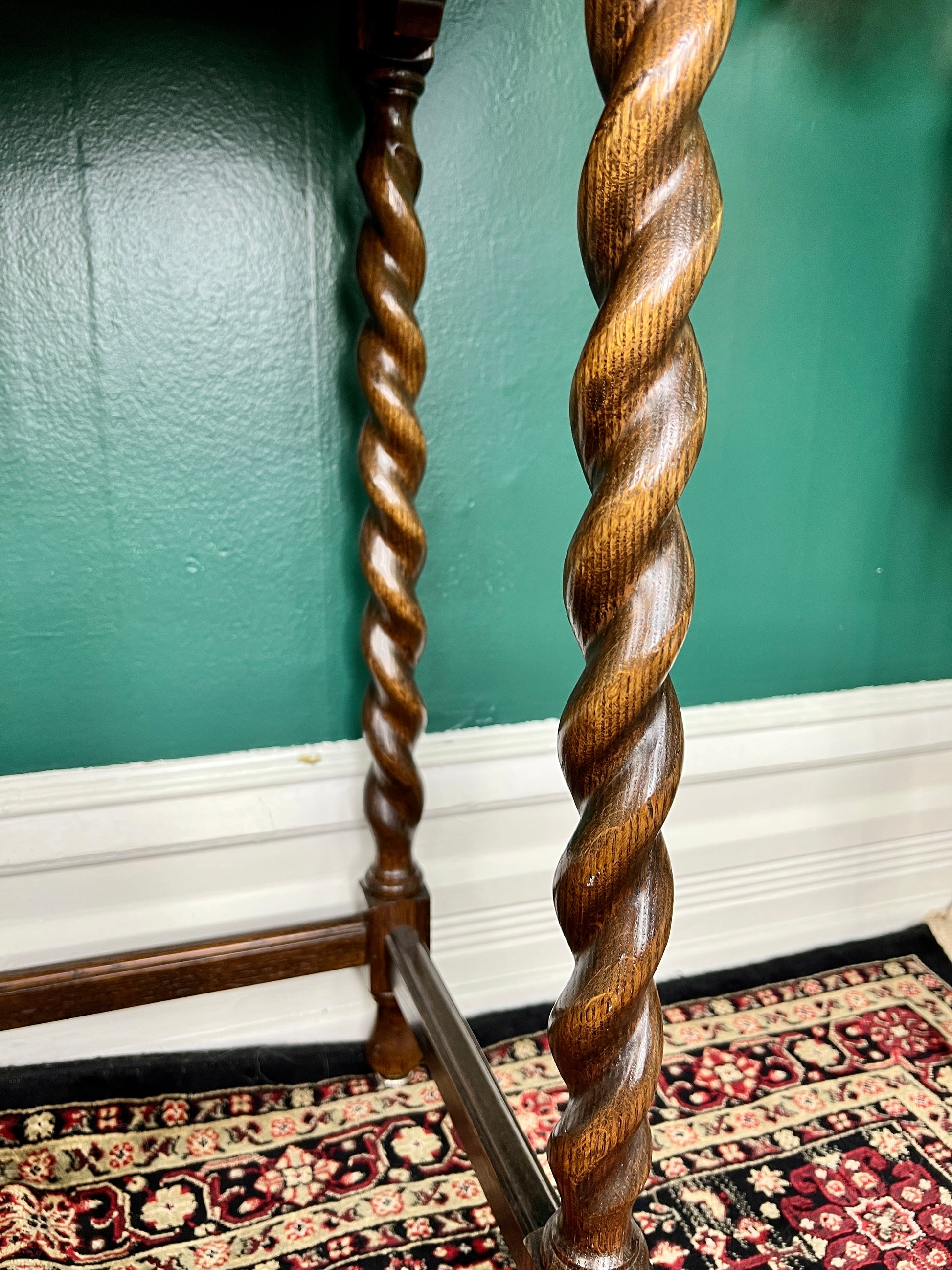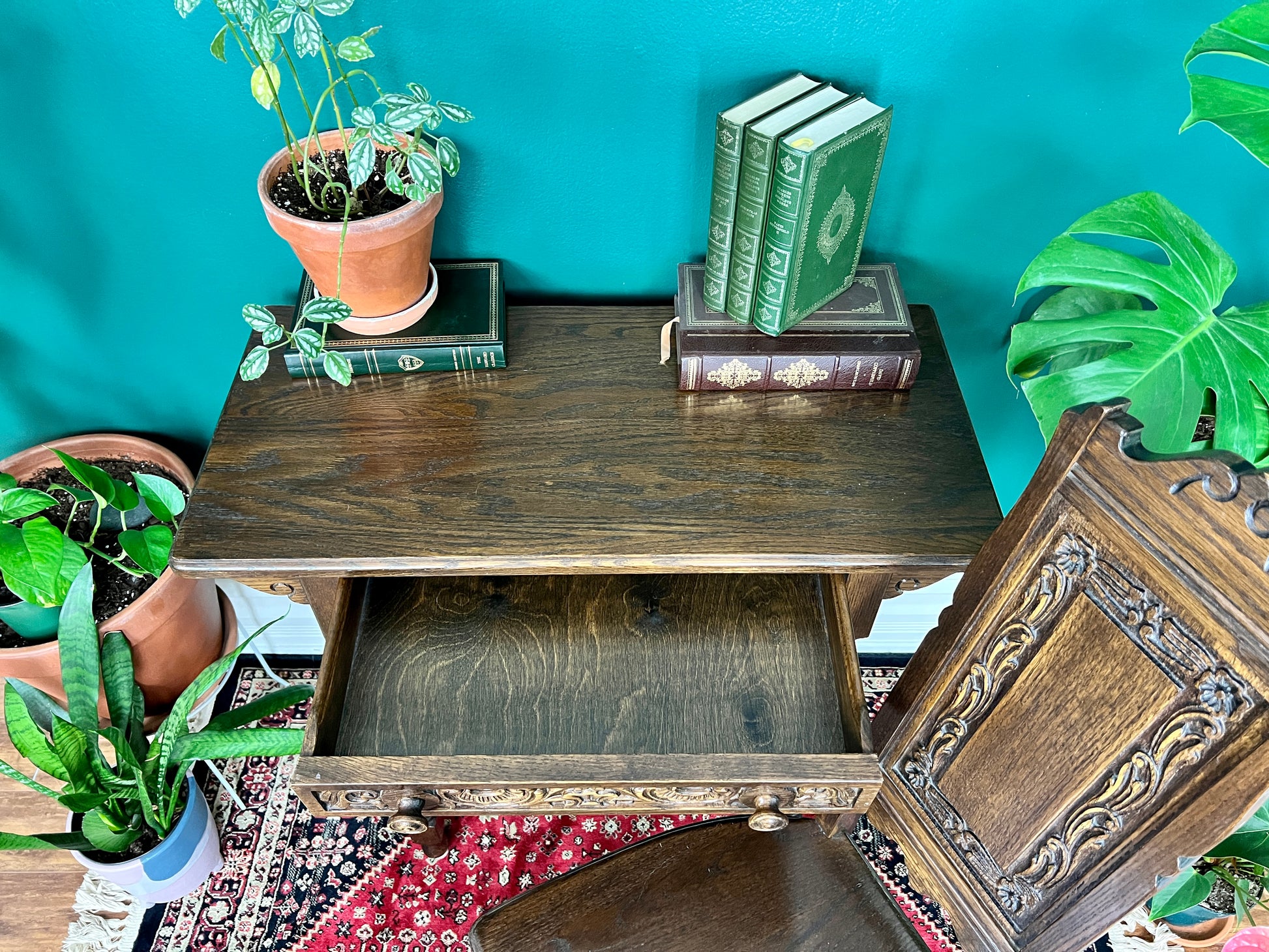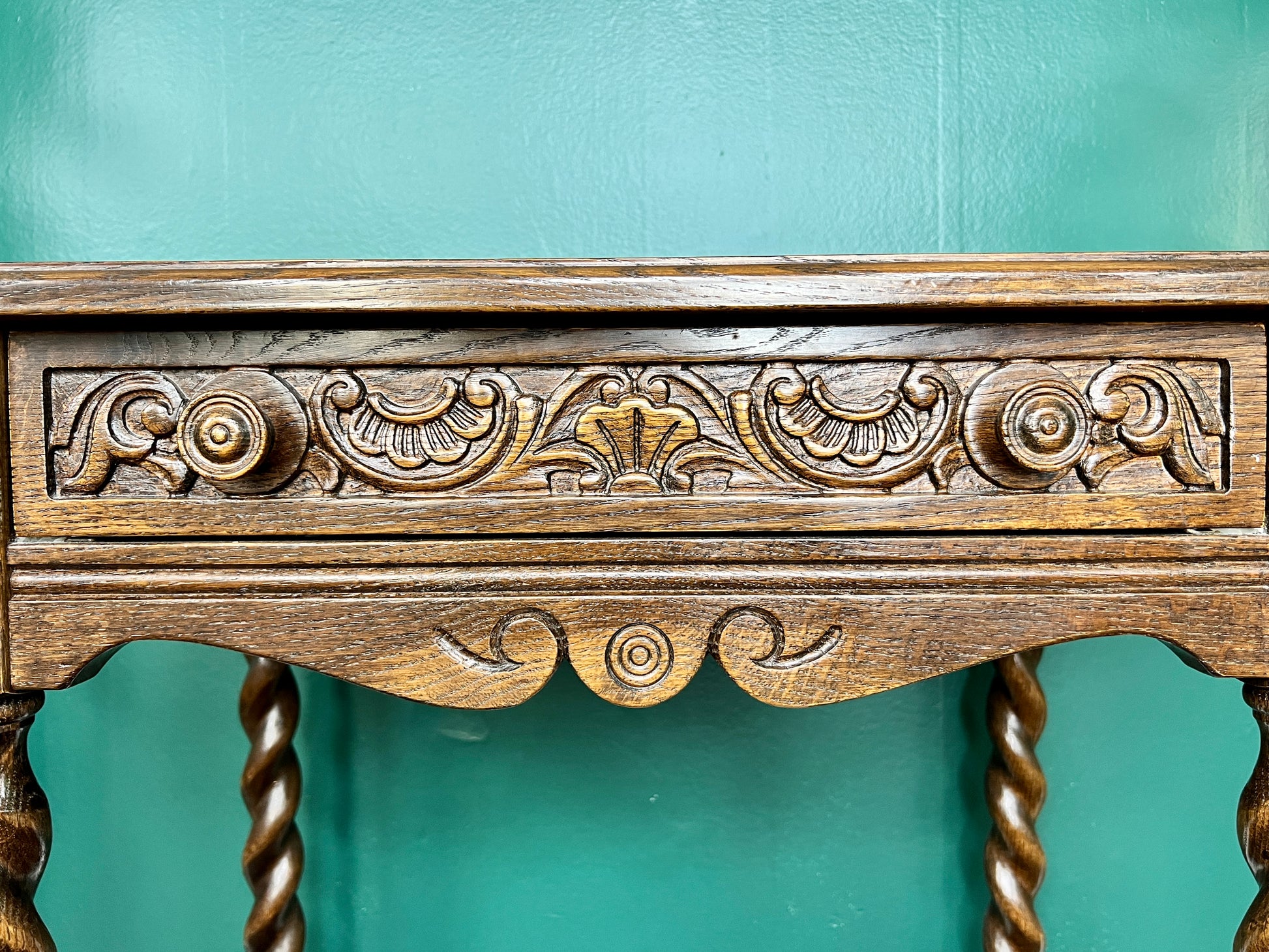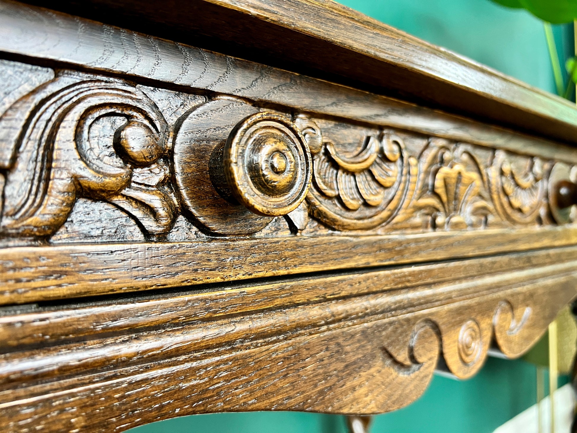 This desk & chair are so freaking beautiful! Look at the intricately hand carved twisted legs, the hand carved detailing on the drawer & chair - it's simply oak-tastic!