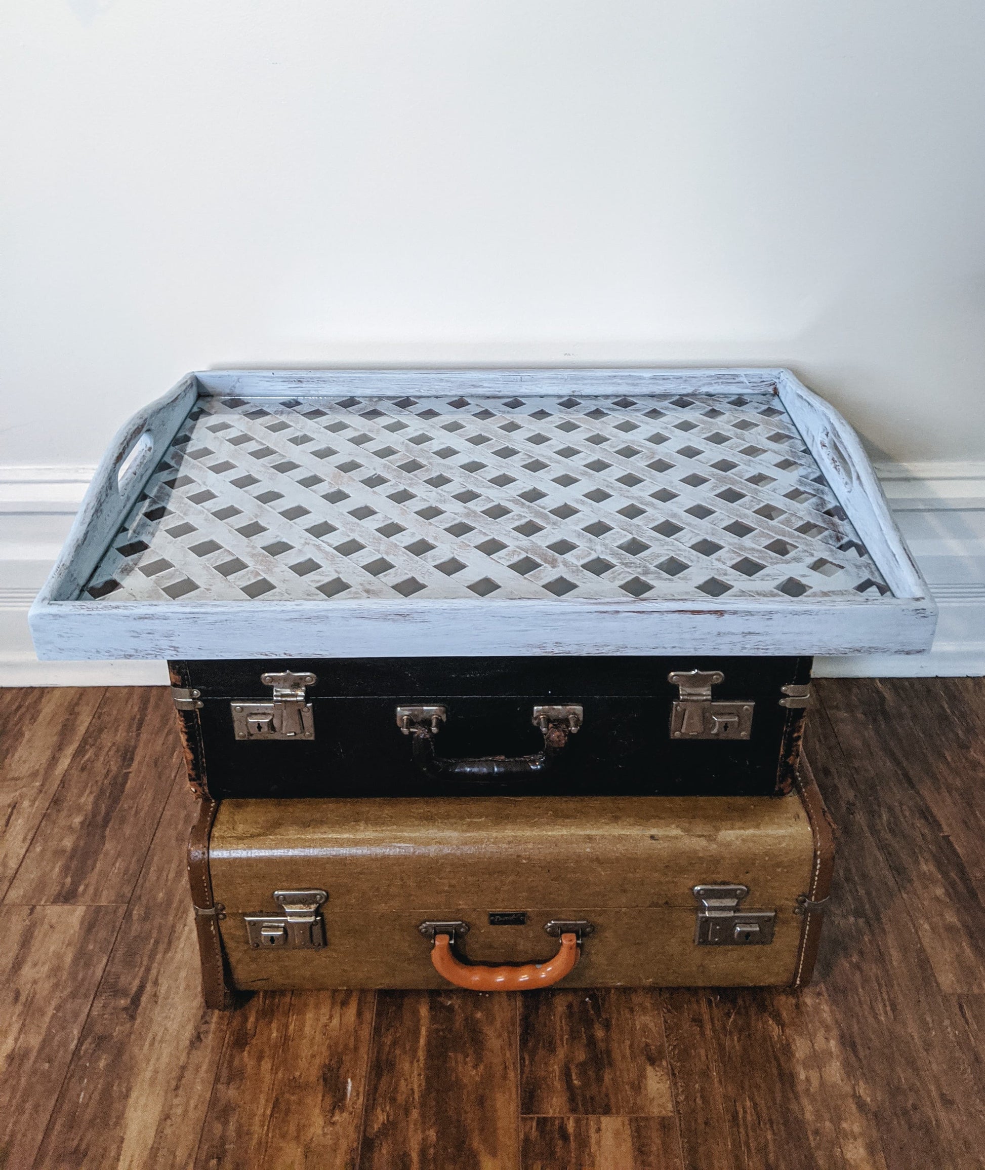 - Made from sturdy wood construction, painted in a blue distressed look