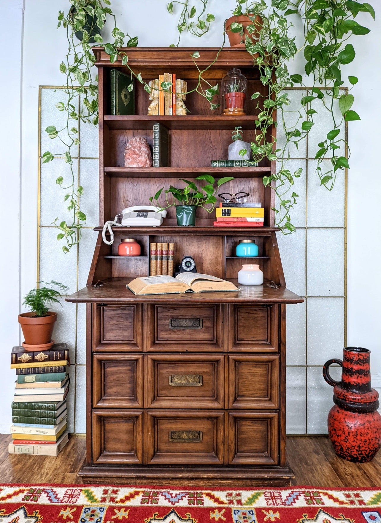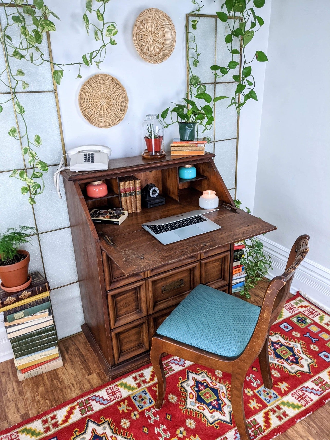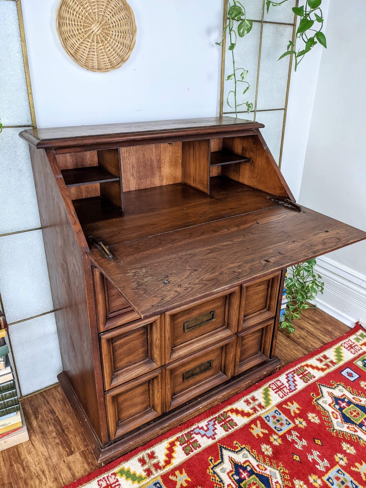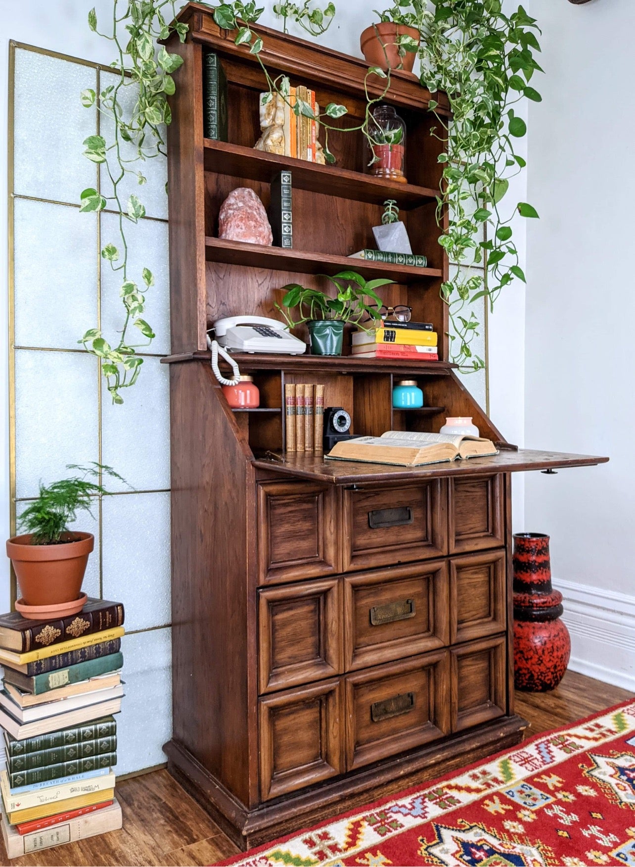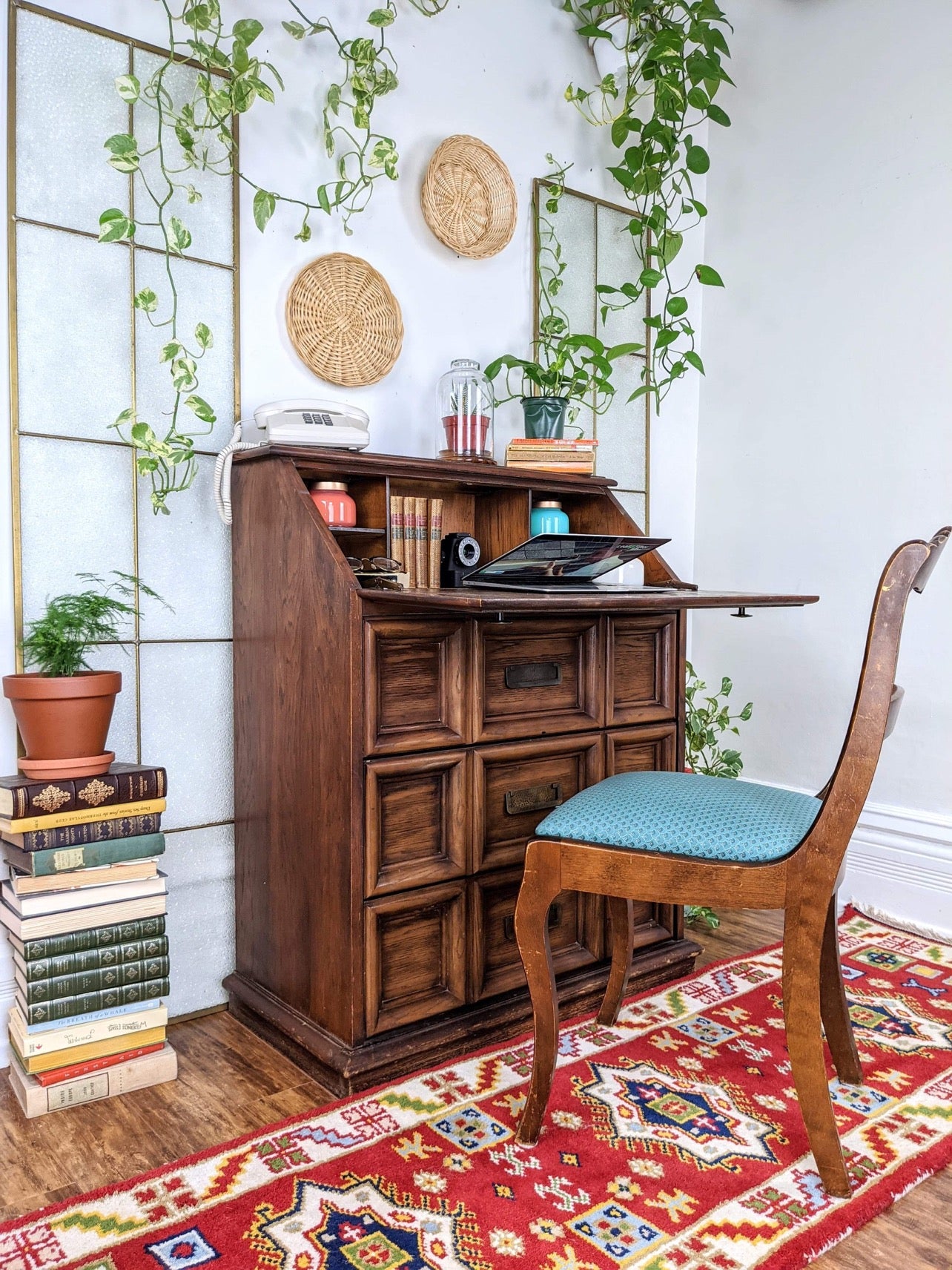 It would be great as a writing space in your living room or use it as a fancy dresser for your bedroom. You could keep clothes in there, even open the desk part up & display plants and knick-knacks - the possibilities are endless!