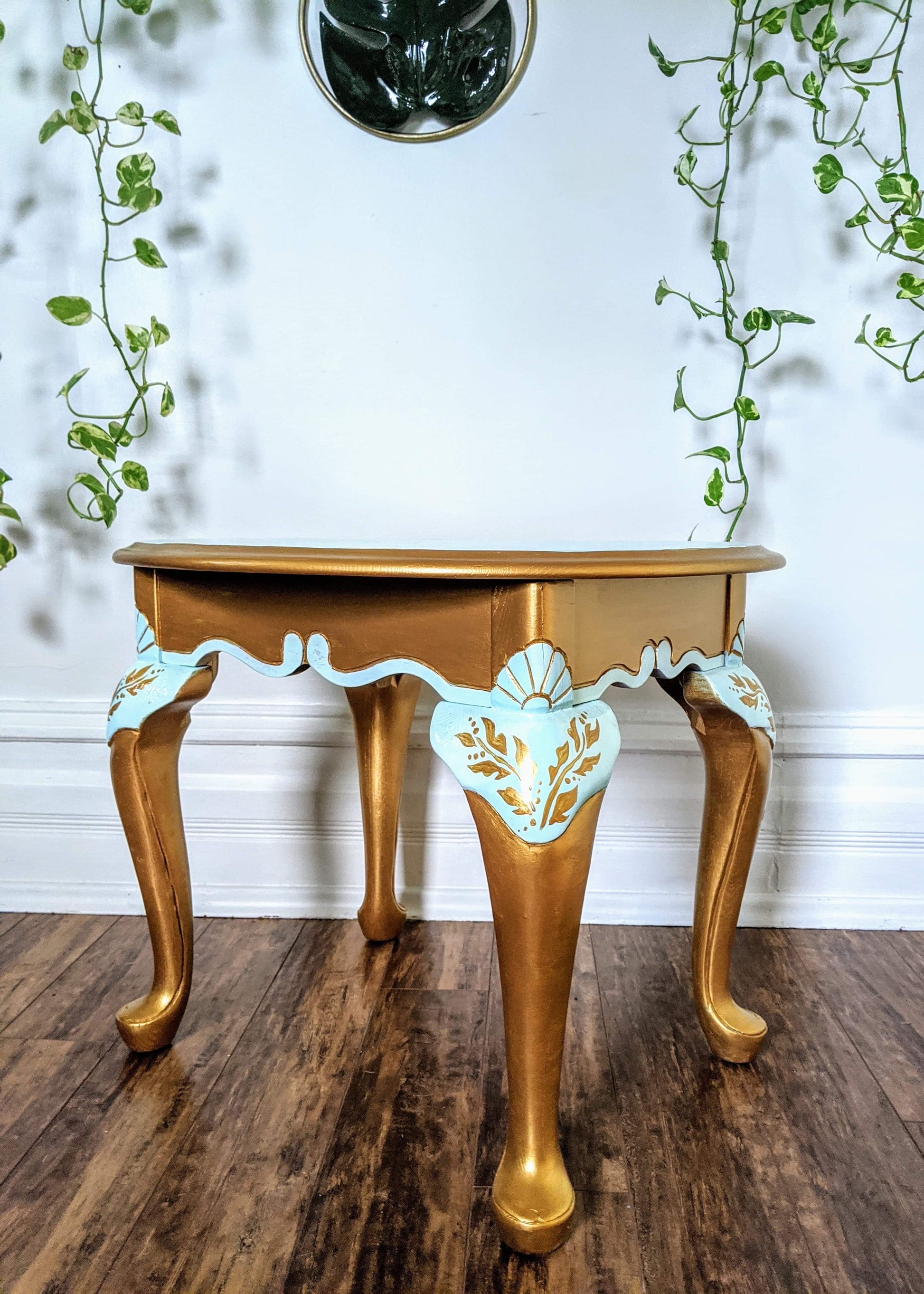 Small & dignified The Teal & Gold Table can be used as a fancy coffee table or side table. It may look super refined, but it does not have a big ego. It will be content to live where ever you put it in your home and display whatever you want it to - it does not have a pretentious bone in its body - we promise ; )
