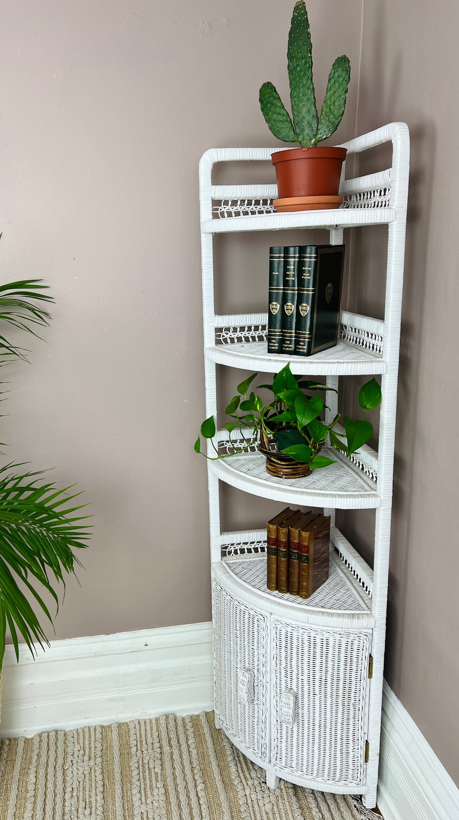 - Vintage white wicker corner shelf