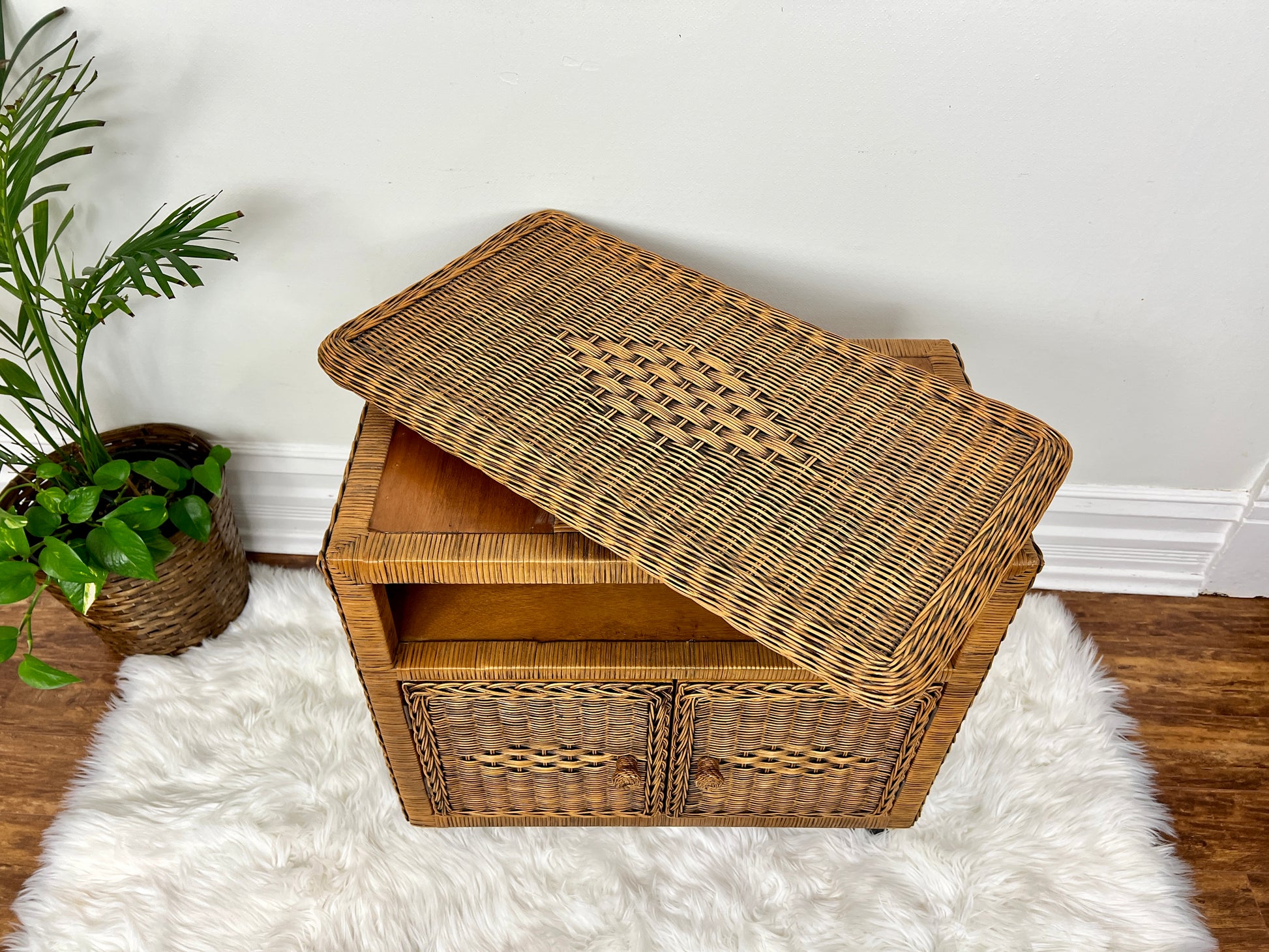 Made from wicker & reinforced with wood, this unit is built to last. Plus it comes on wheels so you can move it anywhere you want & the top swivels, so you can put a tv on it or anything you like for that matter.