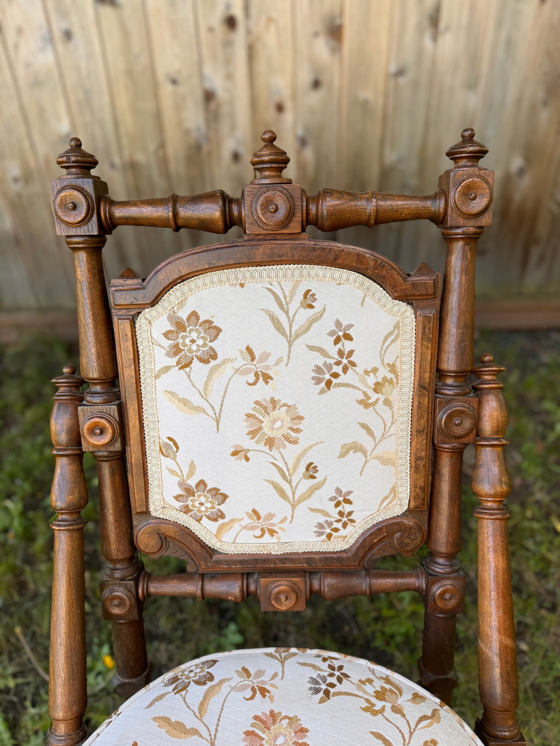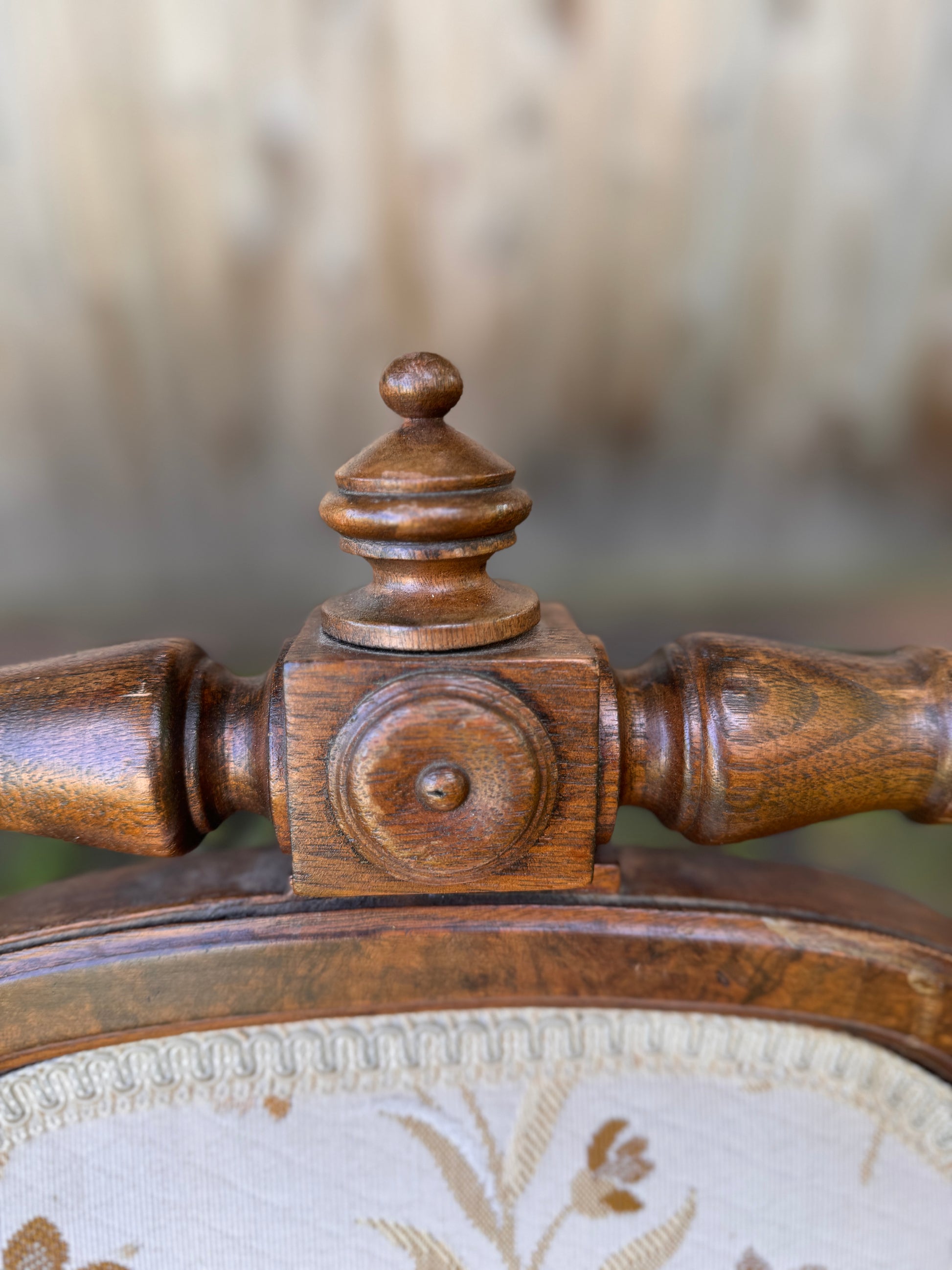 Stunning antique Victorian solid wood folding chair with floral embroidered upholstery.