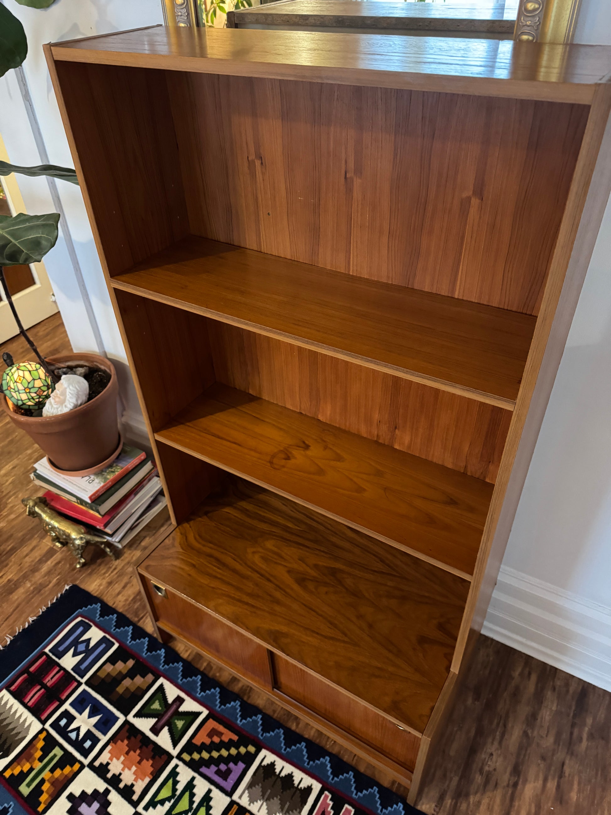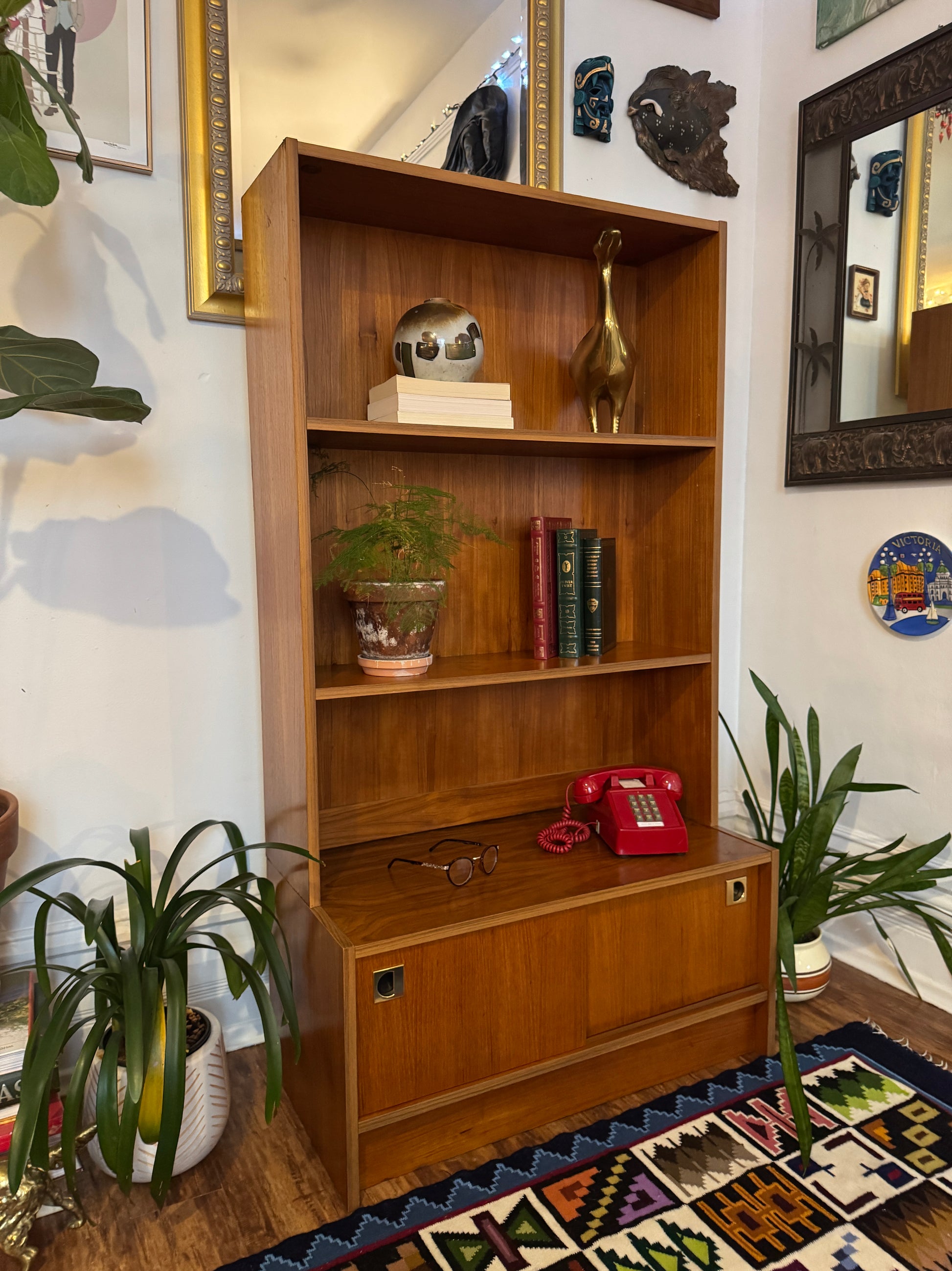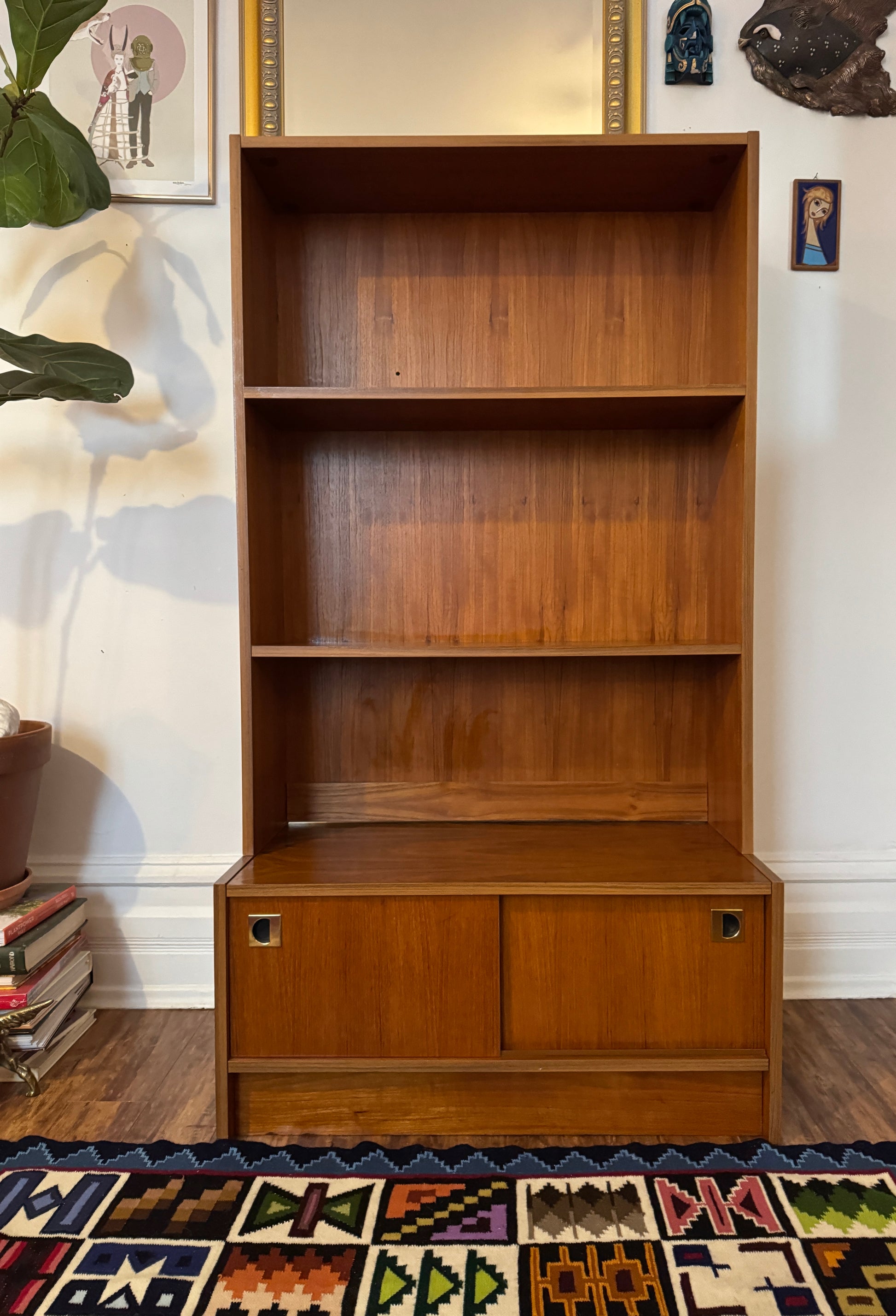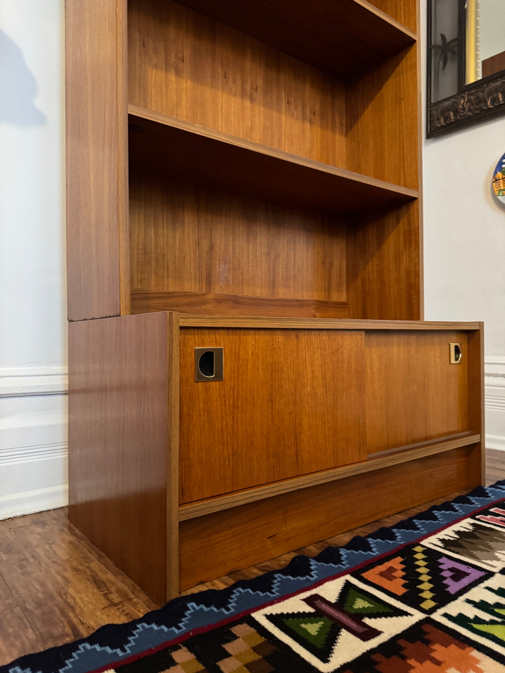Vintage Danish teak bookcase with adjustable shelf and lower cabinet with sliding doors.